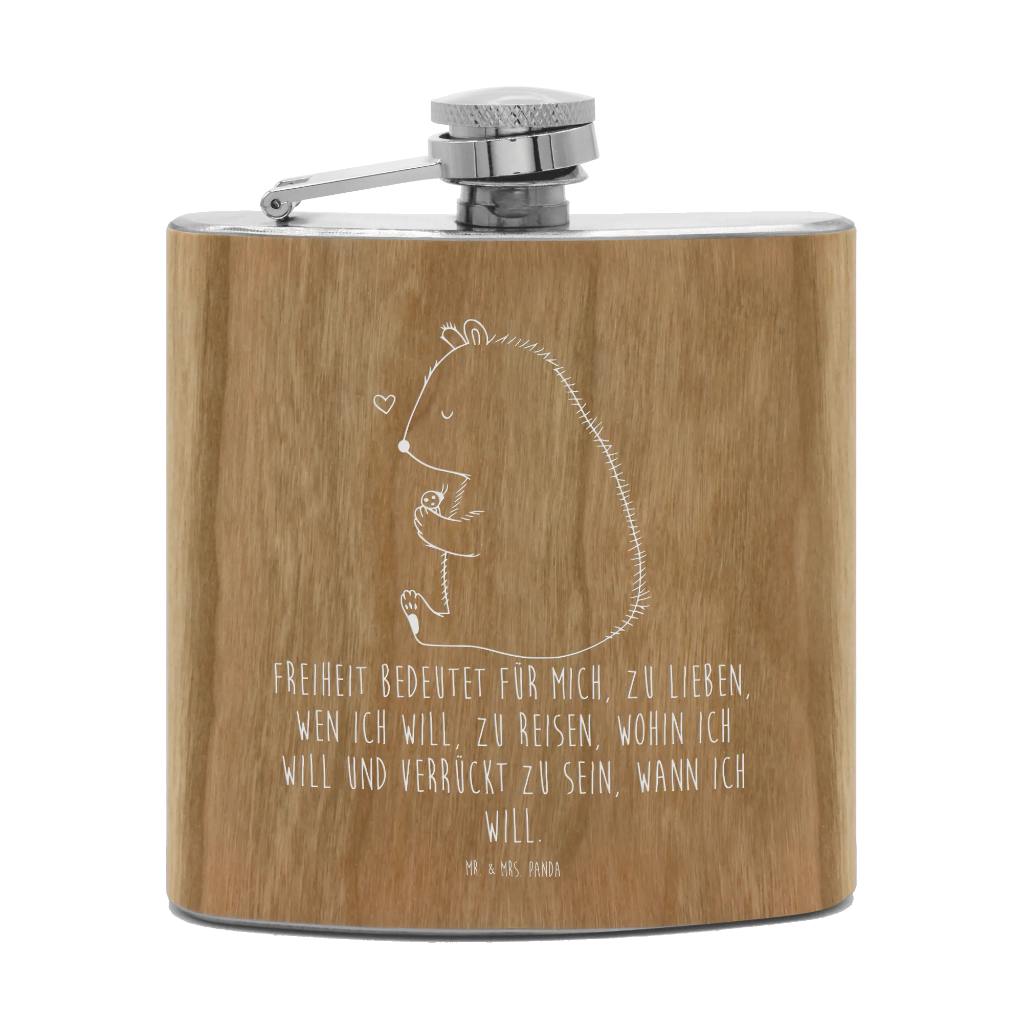Meet the Mr. & Mrs. Panda Hipflask—your new favorite accessory for all occasions! Crafted from premium stainless steel and adorned with a chic wood laminate, this flask can hold 150 ml (5 oz) of your favorite beverage. At 109 mm (4 inch) tall, 93 mm (4 inch) wide, and 22 mm (1 inch) thick, it’s designed for convenience and ease of transport. Featuring delightful engravings of whimsical quotes and cute motifs, this flask will make a wonderful gift for friends. It's the perfect companion for a bachelor or bachelorette party, or for outdoor adventures like hiking! Light and practical, the hipflask fits nicely in your hand and is fitted with a secure screw cap. Remember, it’s not dishwasher safe, so just swish it out with hot water for a quick clean! Elevate your drink game with the stylish Mr. & Mrs. Panda Hipflask!