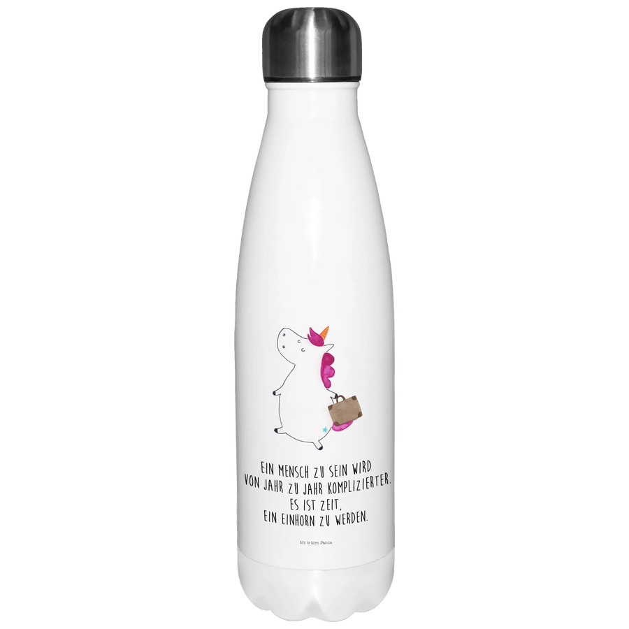 Diese liebevoll gestaltete Isolierflasche aus der Einhorn - Kollektion vereint praktischen Nutzen mit zauberhaftem Design. Das handgezeichnete Einhorn mit Koffer und der freche Spruch „Ein Mensch zu sein wird von Jahr zu Jahr komplizierter. Es ist Zeit, ein Einhorn zu werden.“ schenken dir jeden Tag ein Lächeln.