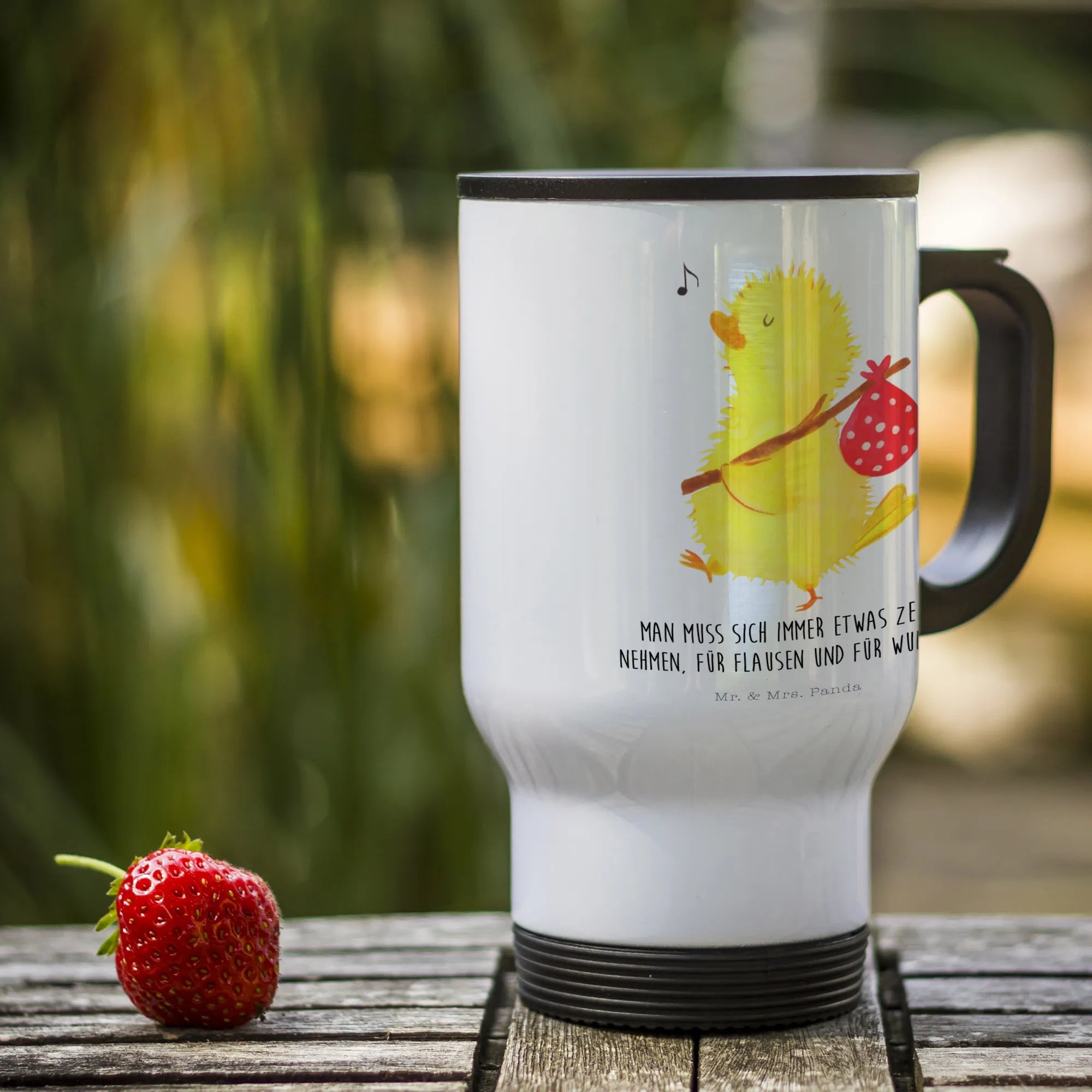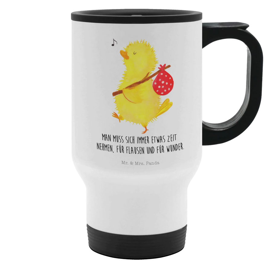 Its adorable motif features a proud little chick with a tiny backpack, symbolizing adventure and the hidden miracles in everyday life. The message behind this design is simple but profound: "Man muss sich immer etwas Zeit Nehmen, für Flausen und für Wunder." It encourages you to take a moment to appreciate the small joys and whimsical wonders, perfect for those who love to travel and experience life to the fullest.