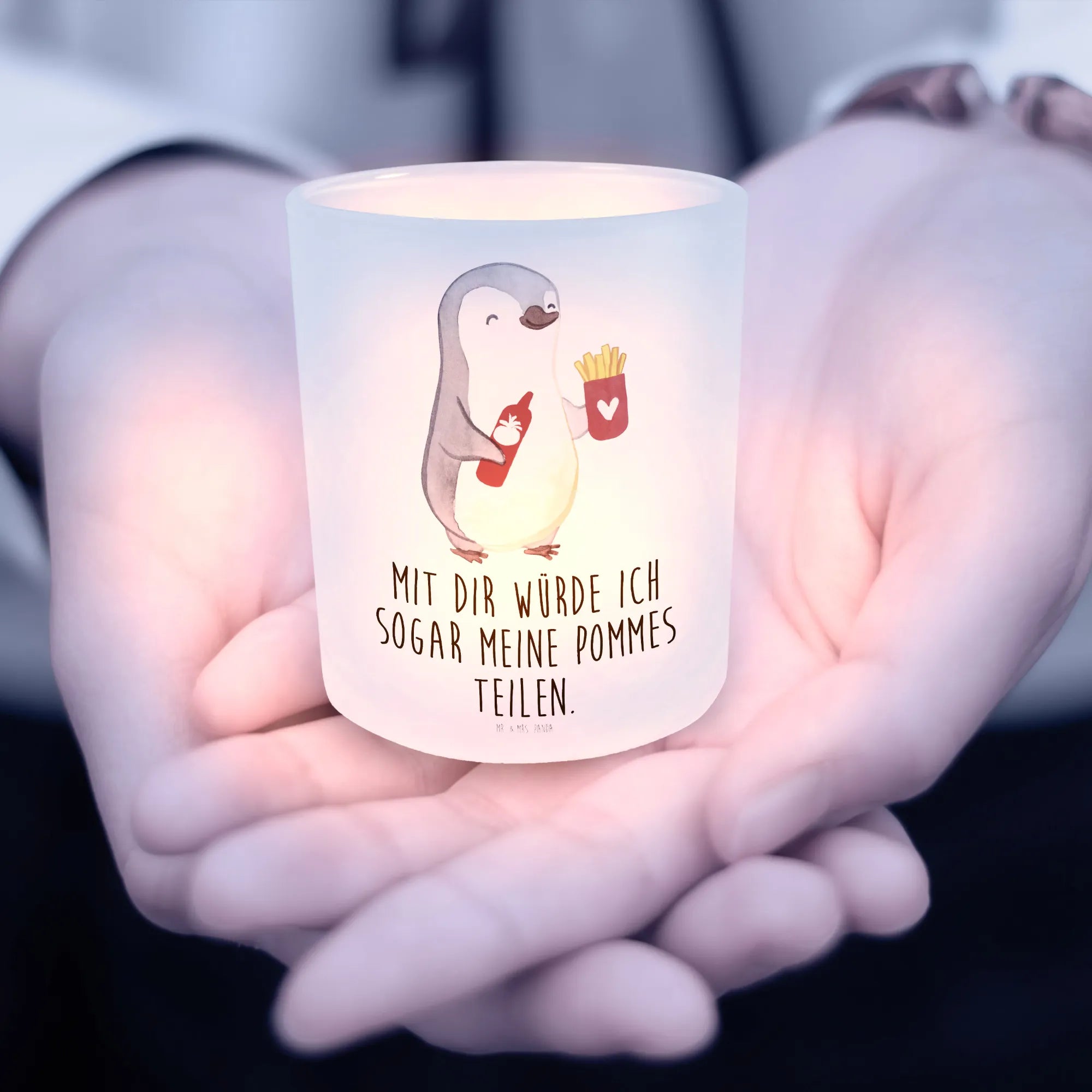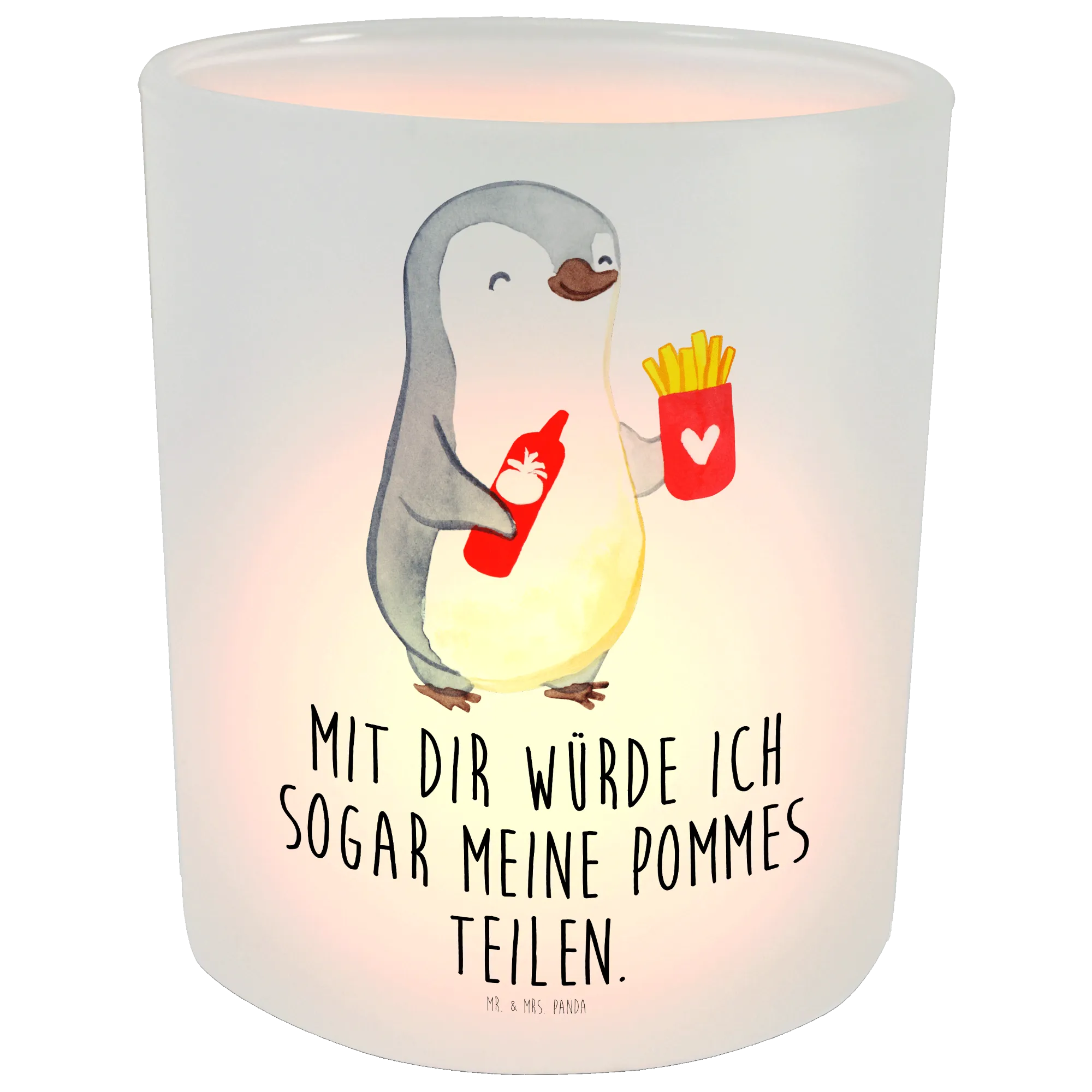 Our charming penguin motif brings a splash of warmth and joy, perfect for sharing love and laughter with someone special. Holding a cup of fries in one wing and a bottle of ketchup in the other, this delightful penguin reflects a playful spirit and a heart full of affection. The slogan, 'Mit dir würde ich sogar meine Pommes teilen,' captures the essence of true love — the willingness to share even the smallest delights. Ideal as a Valentine's Day gift or a sweet anniversary surprise, this motif is crafted with soft colors and a friendly expression that resonates with the warmth of connection. Whether it’s for a girlfriend, partner, or husband, this little guy symbolizes all the fun and happiness that come with being together. Every glance at this lovable penguin is a reminder that love is about sharing the good times, even when it comes to the crispiest fries.