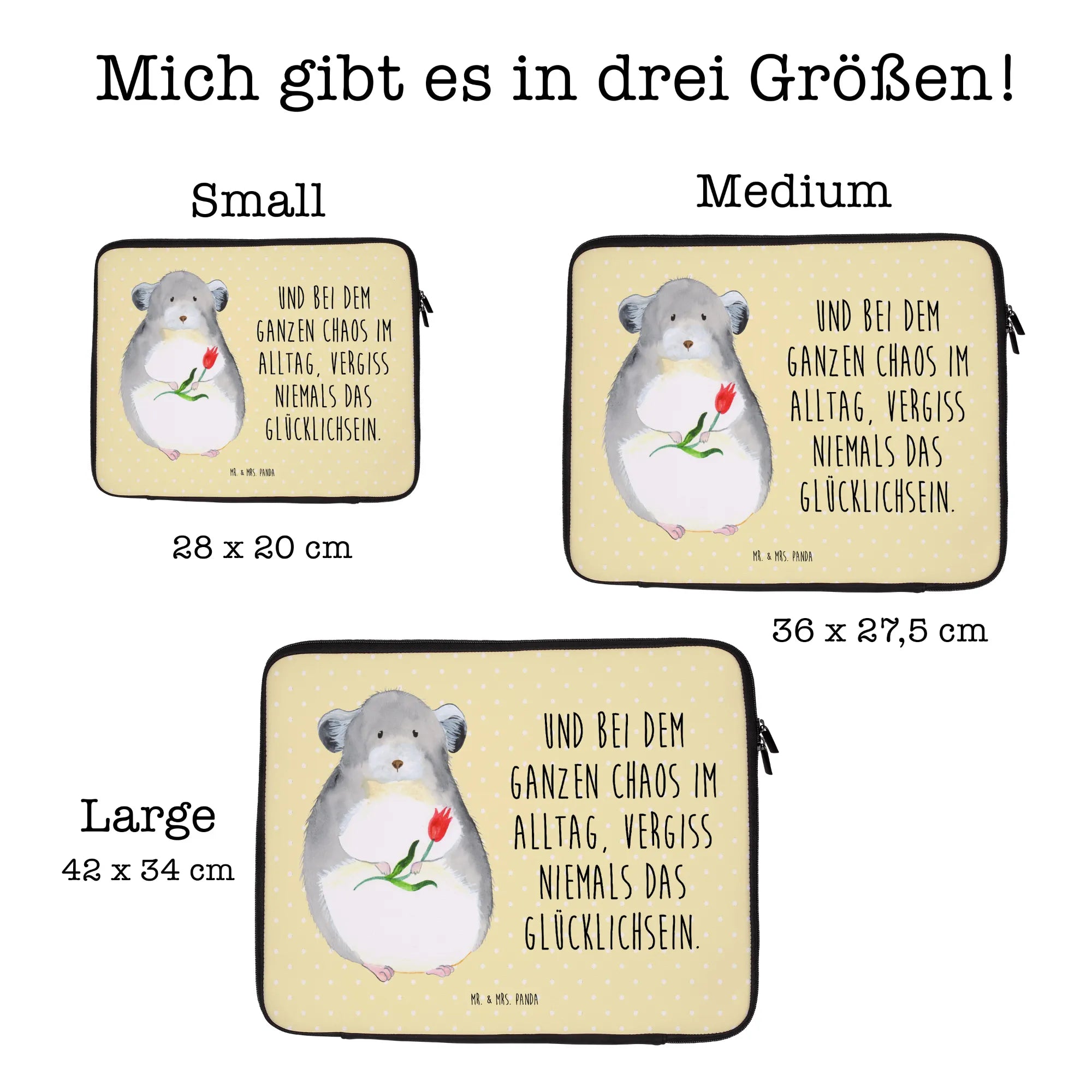 Experience the charm of the Notebook Tasche from Mr. & Mrs. Panda! Specifically designed for on-the-go lifestyles, this lightweight bag measures 420 mm x 320 mm x 30 mm to fit your laptop snugly. Made of high-quality, water-repellent neoprene, this bag protects your device against scrapes and everyday wear and tear. Beautifully styled with fun Mr. & Mrs. Panda graphics, it’s a delightful companion for anyone. The reliable zip closure secures your laptop and prevents it from slipping out during transport. Perfect for students, professionals, and anyone who loves to carry their tech stylishly. Available in various sizes, you can easily wipe it clean with a cloth when needed – just remember, it's not machine washable. Whether you’re heading to school, the office, or a temporary workspace, this Notebook Tasche is your must-have accessory!