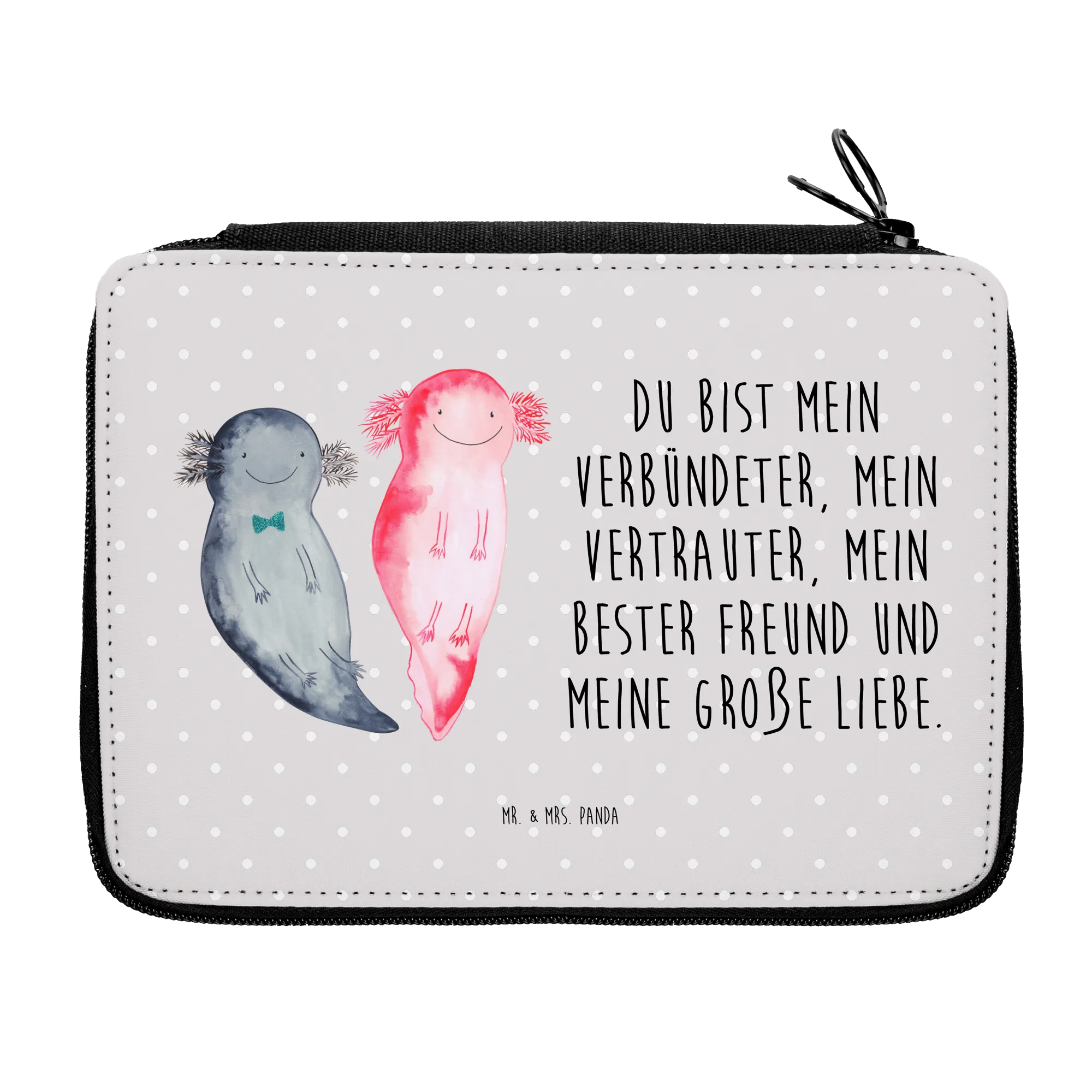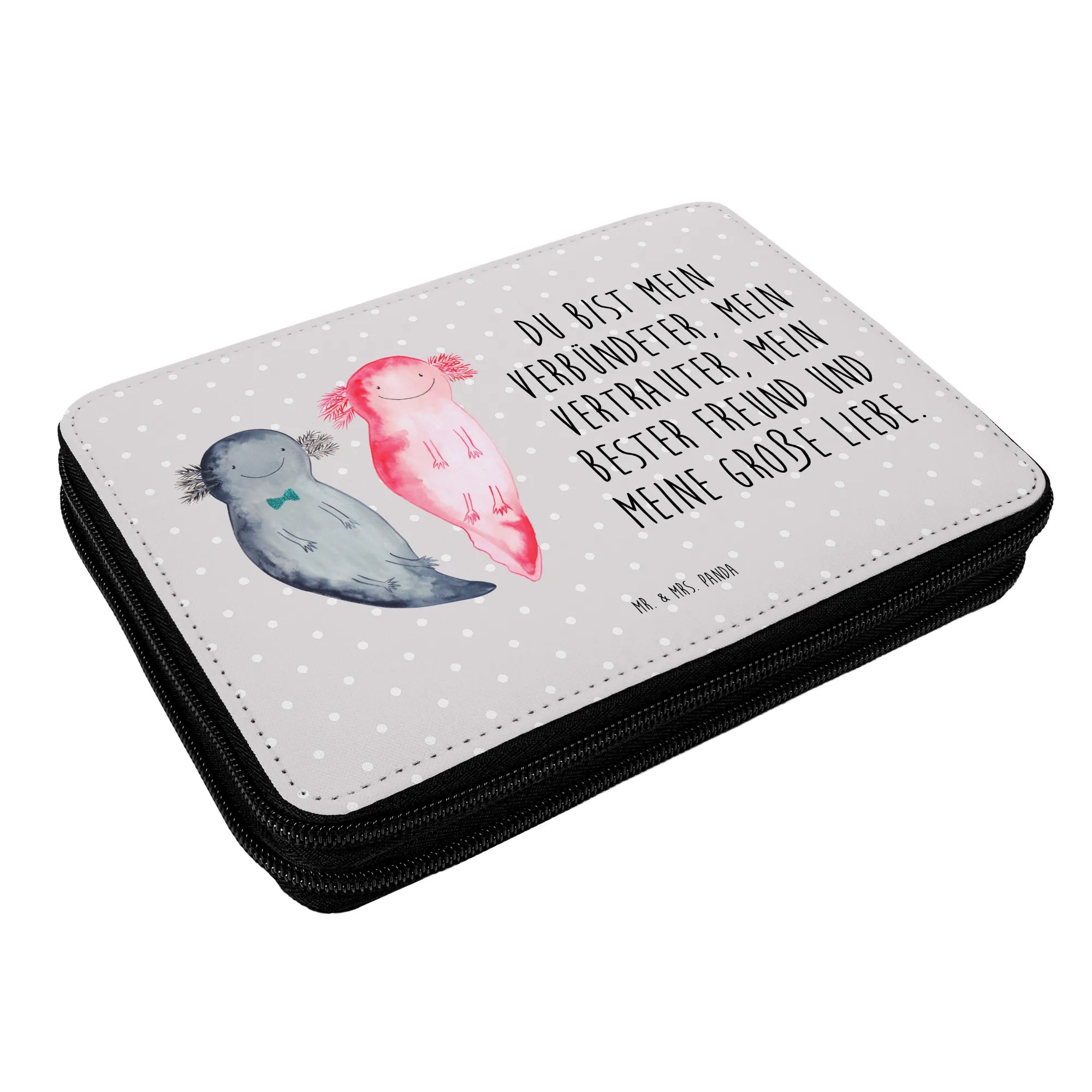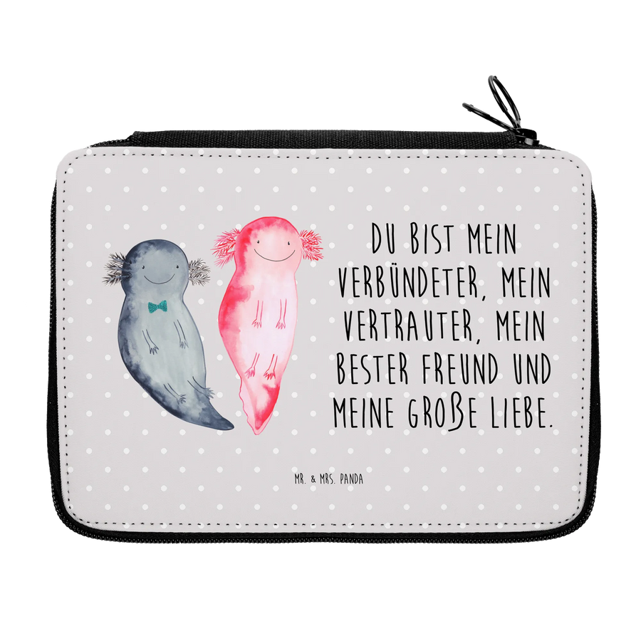 Crafted from high-quality materials, this pencil case measures 210 mm x 210 mm x 40 mm and offers ample space to store all the essentials a pupil might need. Its charming design, depicting two cute axolotls swimming together, captures the hearts of both kids and adults alike. The axolotls are hand-drawn in Mrs. Panda's signature style, bringing a touch of joy and whimsy to your child's school day.