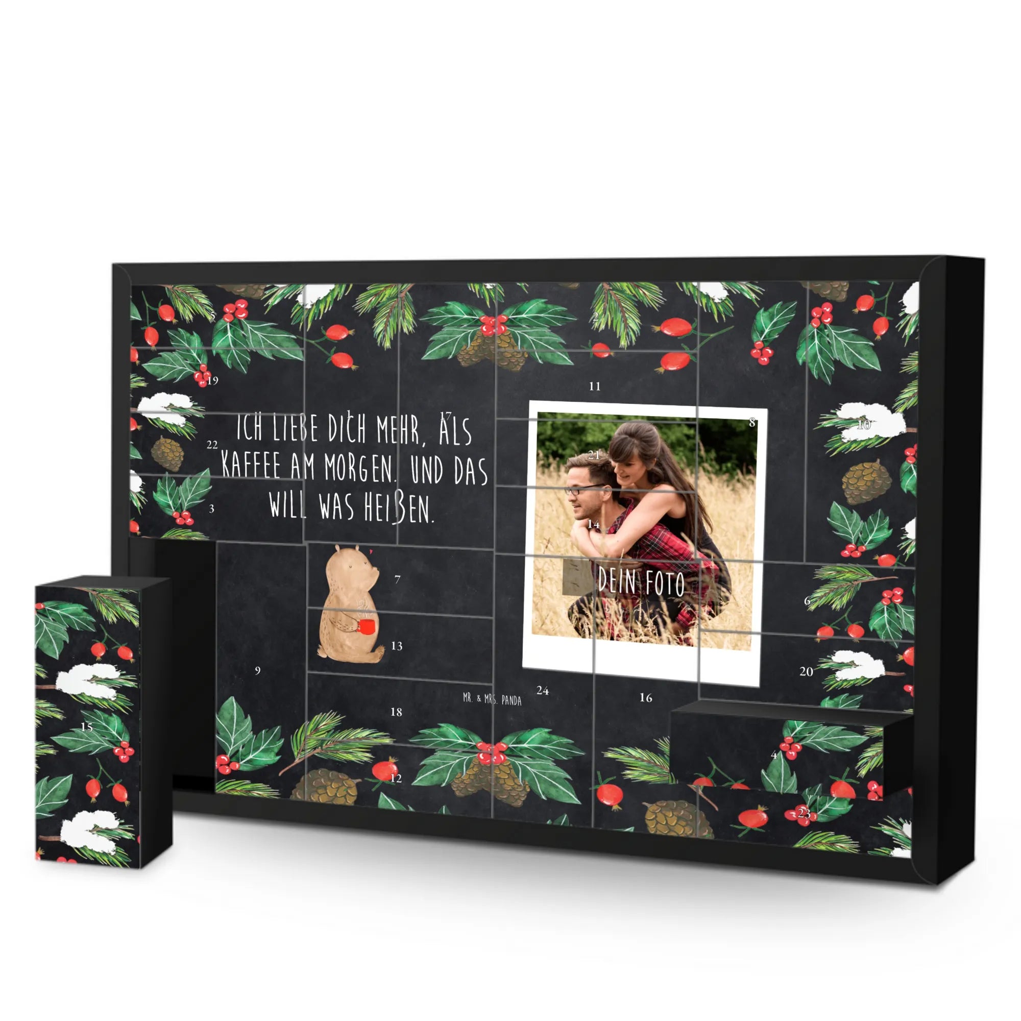 Foto Adventskalender personalisiert von Mr. & Mrs. Panda – mach Weihnachten persönlich und liebevoll! Dieser Adventskalender kombiniert die herzerwärmenden Sprüche und Motive von Mr. & Mrs. Panda mit deinem individuellen Foto auf der Vorderseite. Für ein optimales Druckergebnis lade bitte ein Foto in guter, hoher Auflösung hoch und achte auf den richtigen Bildausschnitt, damit nichts Wichtiges verloren geht. Nutze nur lizenzfreie oder von dir genehmigte Fotos. Die Front ist mit einer zauberhaften Mrs. Panda Zeichnung verziert, gedruckt auf einer seidenmatten Oberfläche in brillanter Qualität. Der Kalender besteht aus stabilem Adventskalender-Karton, bietet 24 Schachteln zum Selbstbefüllen und enthält eine Aufstellvorrichtung. Wichtig: Der Artikel wird ohne Füllung geliefert. Beachte außerdem, dass die Fotos nicht nachbearbeitet oder zugeschnitten werden – personalisierte Foto-Artikel sind vom Umtausch ausgeschlossen. Maße: 619 mm Breite • 405 mm Höhe • 50 mm Tiefe. Verschenke jeden Tag ein kleines Glück mit einem persönlichen Touch.