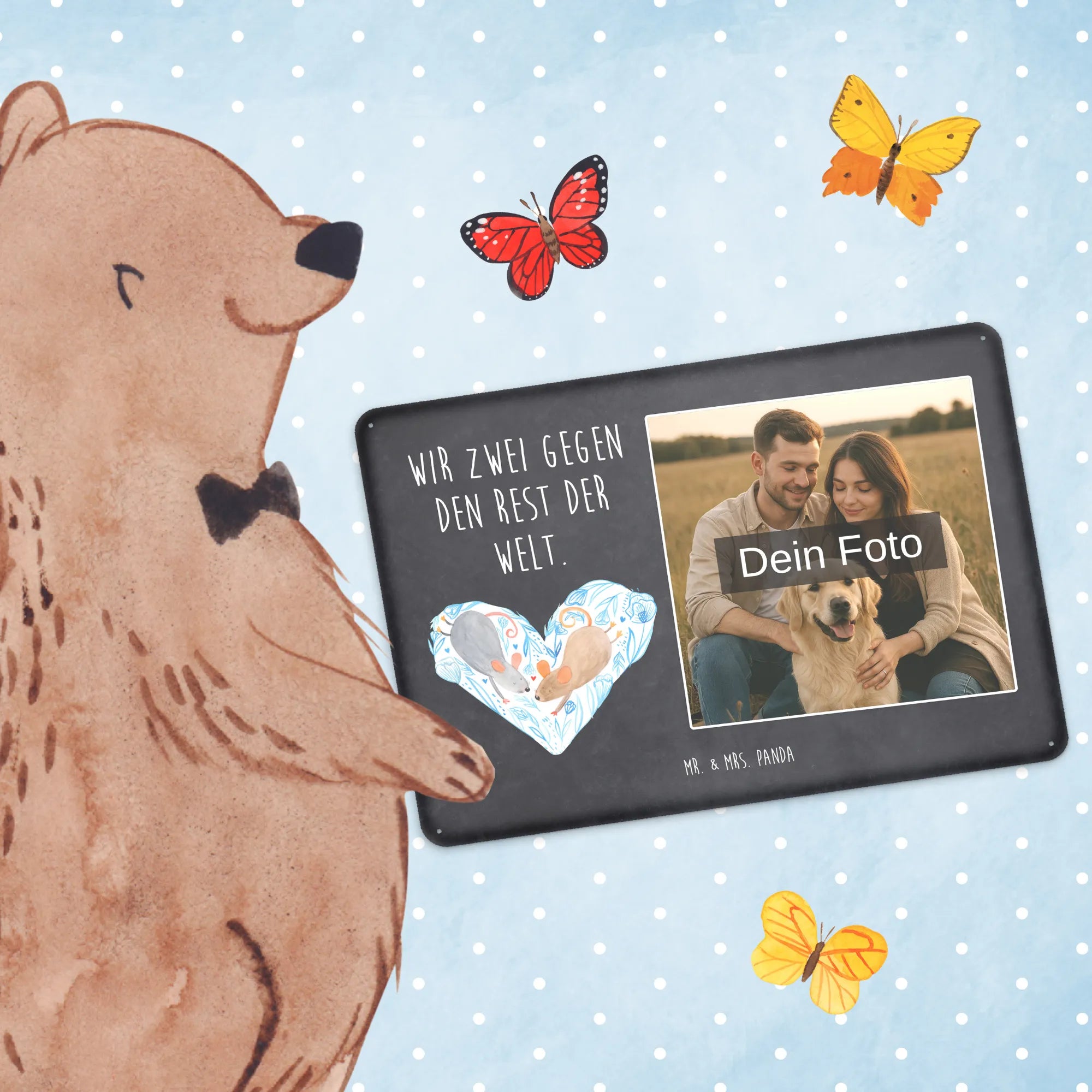 Schenke Persönlichkeit: Erstelle jetzt dein personalisierbares Blechschild Foto mit Mr. & Mrs. Panda – Foto hochladen, Text hinzufügen, bestellen und Freude verschenken.