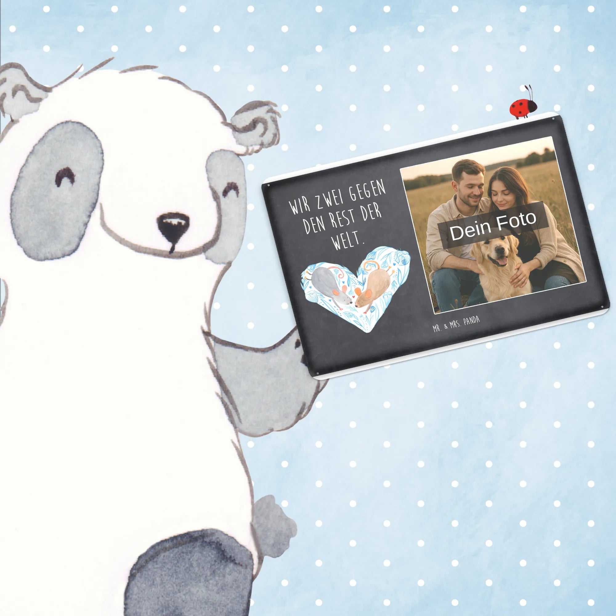 Gestalte dein persönliches Blechschild: Lade dein Foto hoch und kreiere ein einzigartiges Geschenk mit Mr. & Mrs. Panda – schnell gefertigt, liebevoll verpackt.