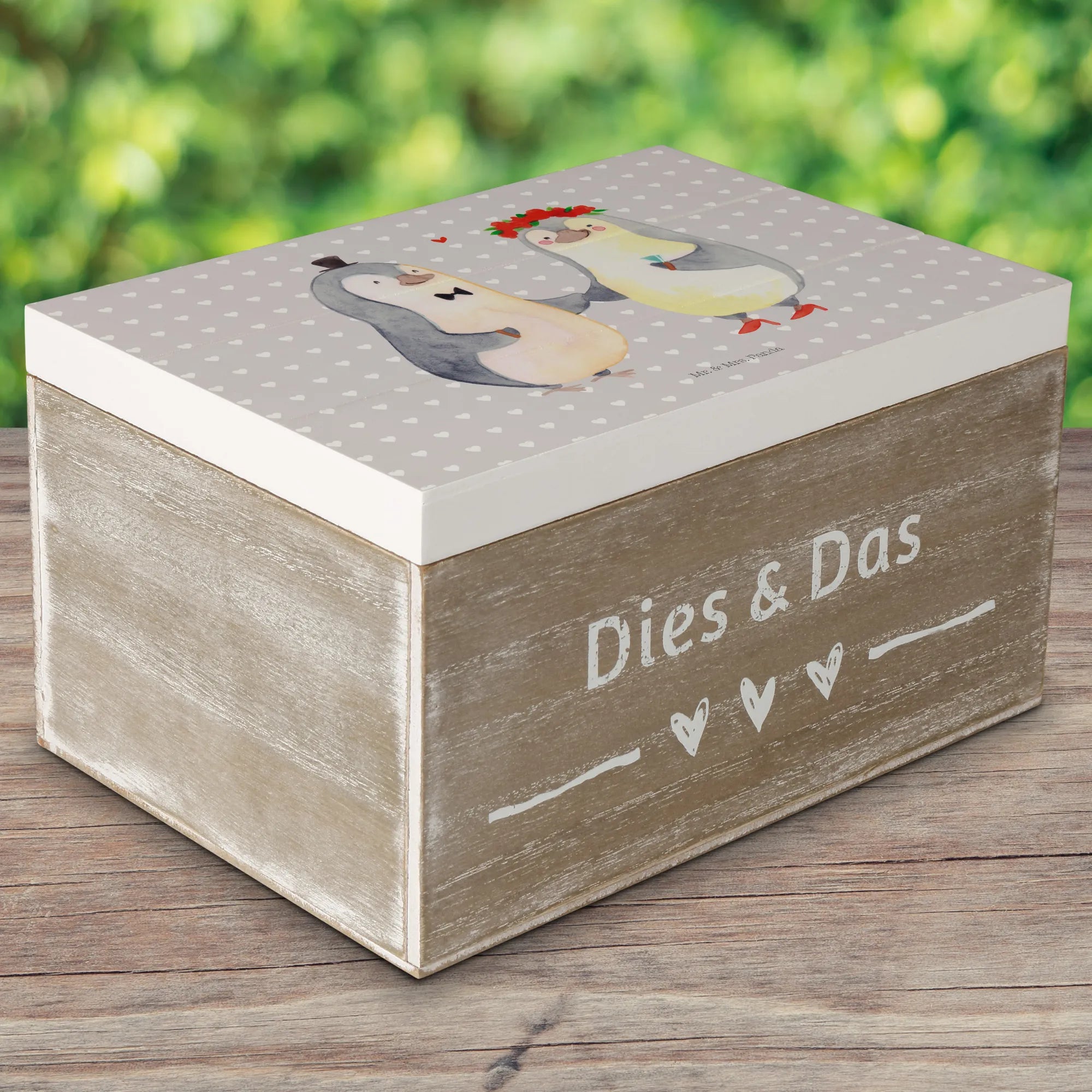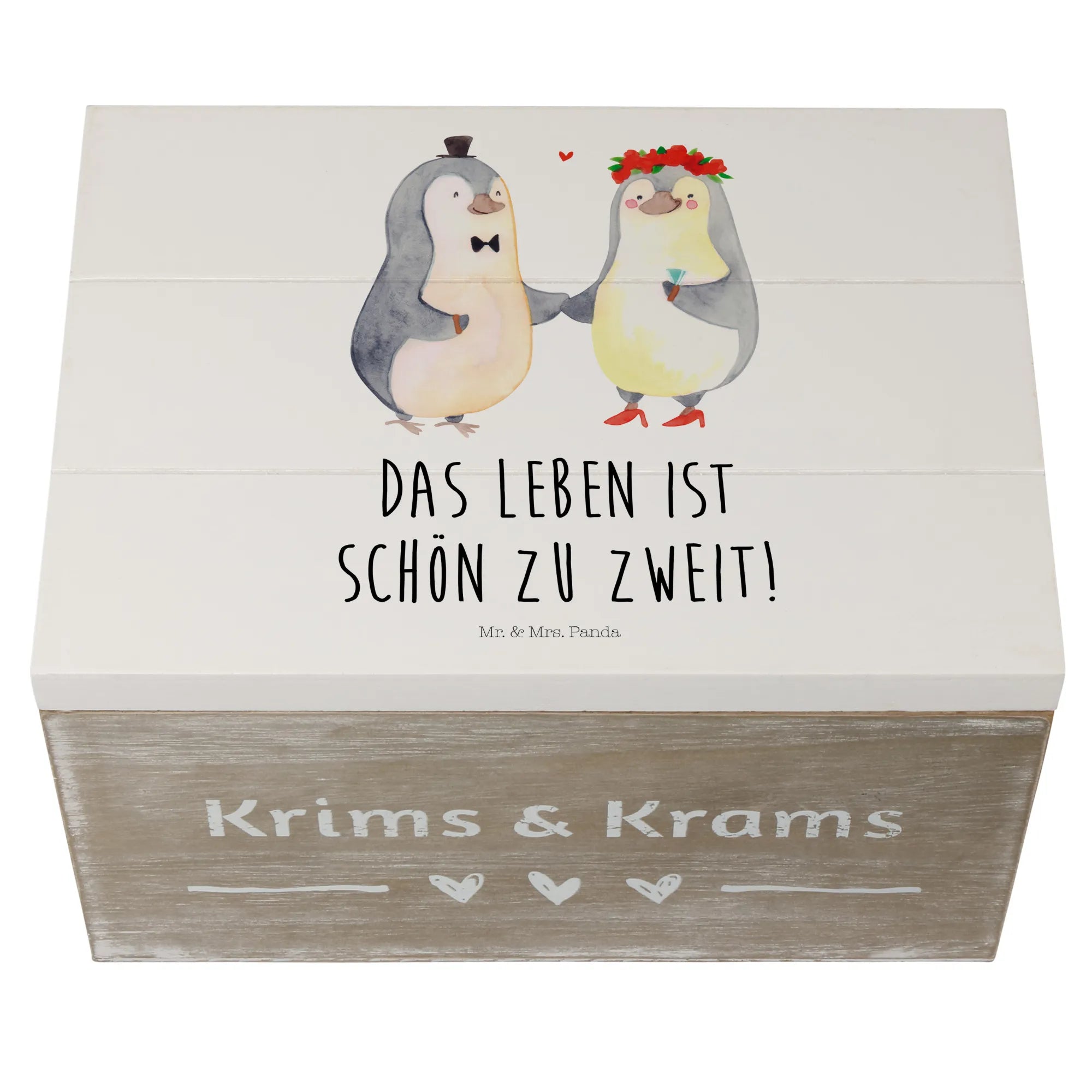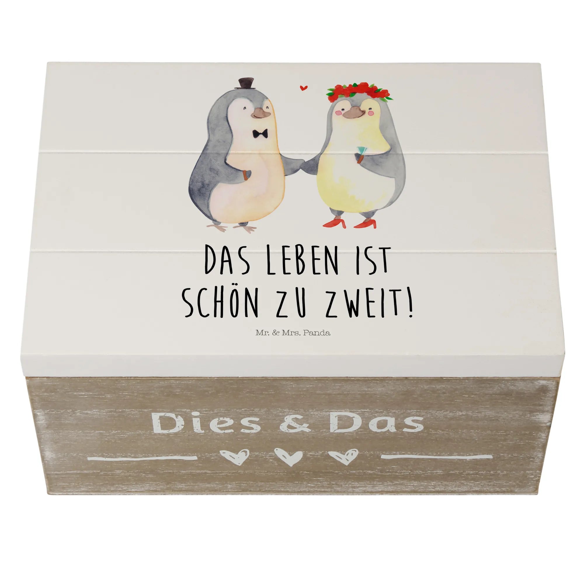 Wooden chest Penguins getting married - 22 x 15 cm - with saying - White