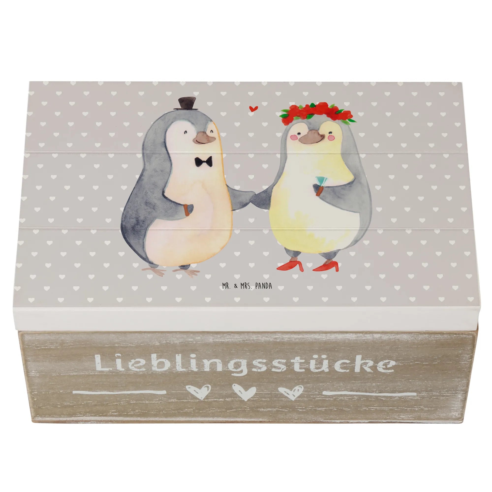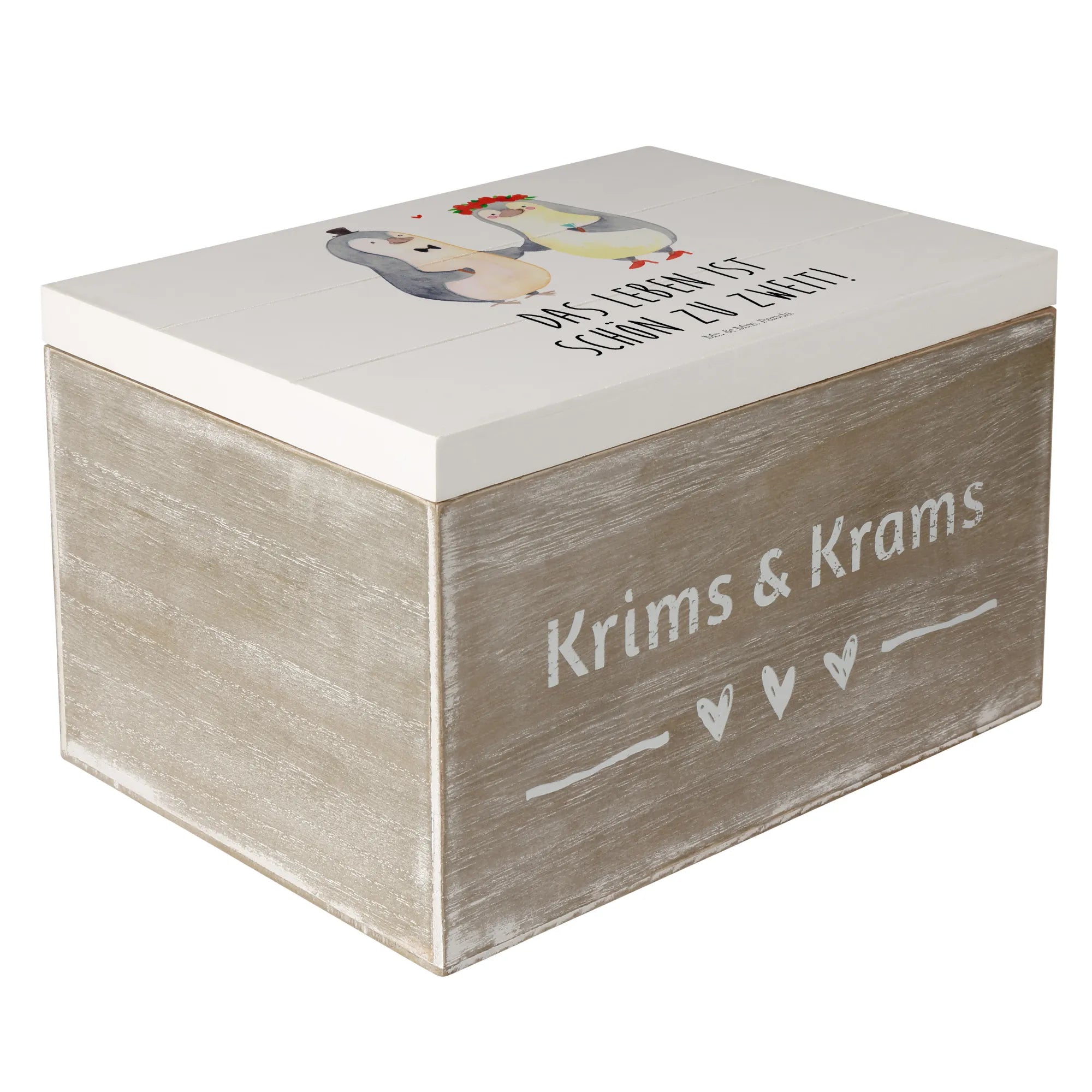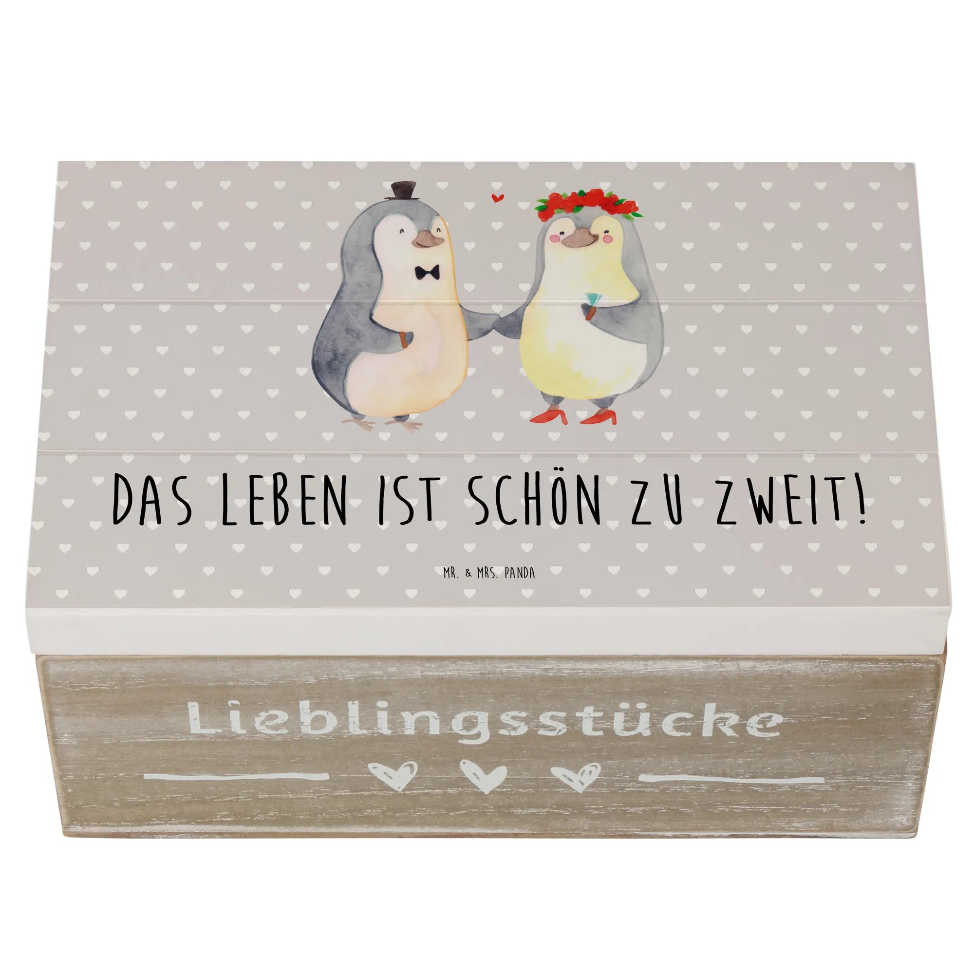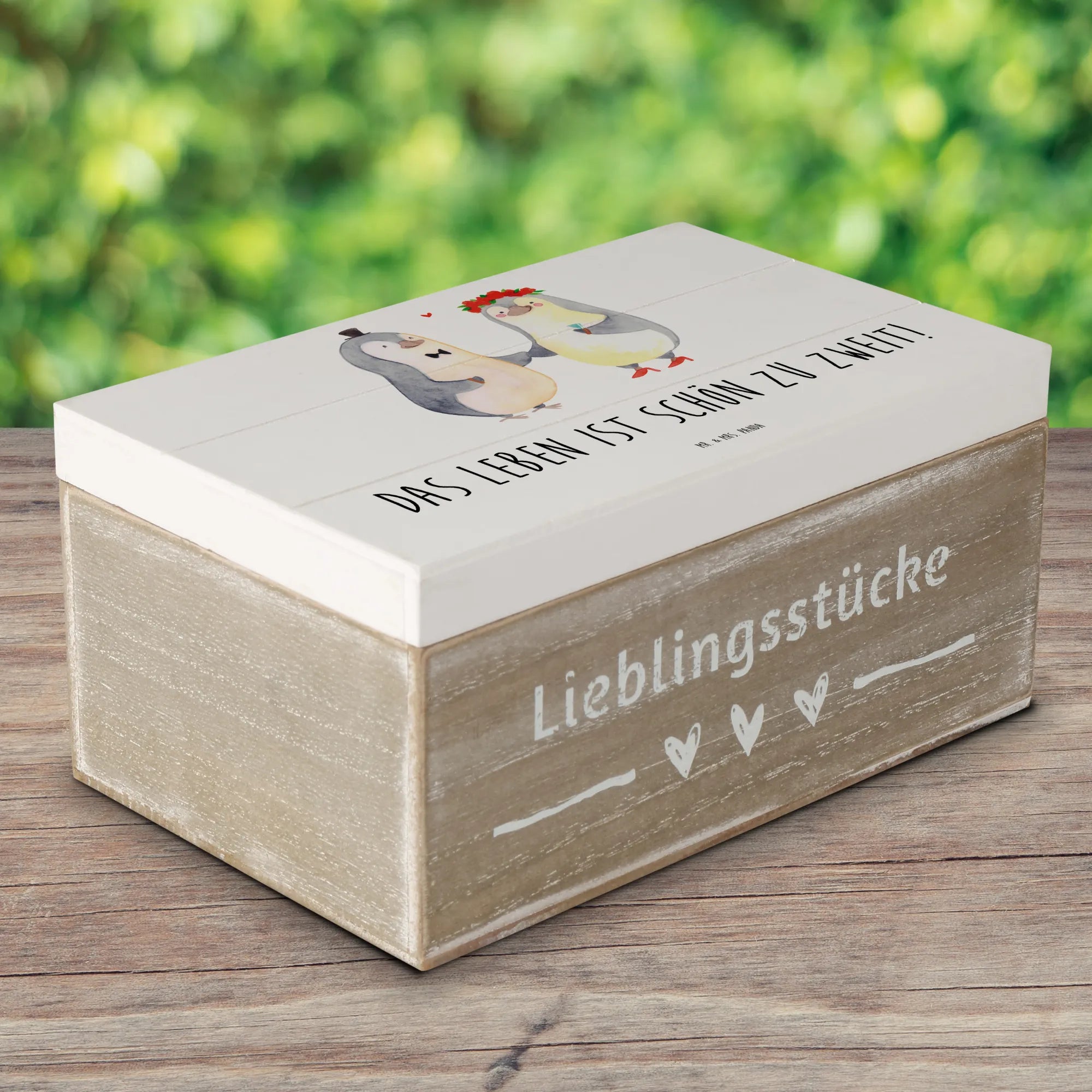 Wooden chest Penguins getting married - 22 x 15 cm - with saying - White