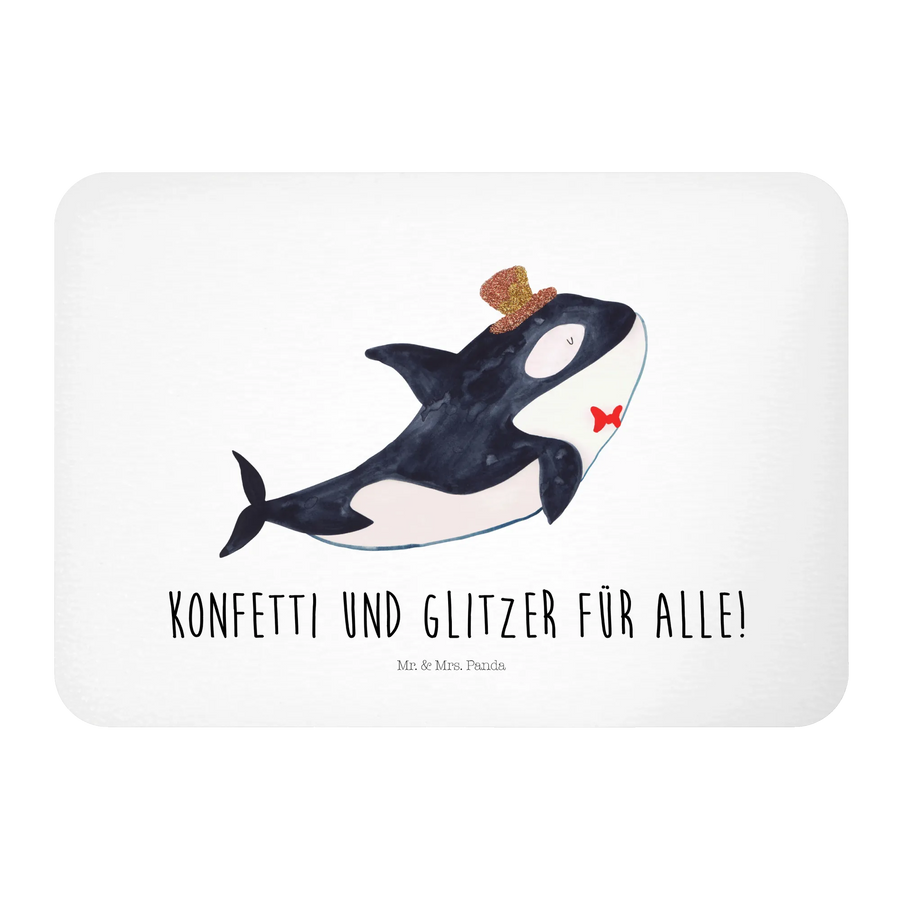 Our orca is here to bring a touch of playful elegance to your celebrations. With its glossy black and white design, accented by a vibrant cylinder hat embellished with flowers, this motif radiates charm and joy. Don't forget the adorable little red fish adding an extra hint of fun! 'Konfetti und Glitzer für alle!' perfectly captures the spirit of joy and celebration, making it ideal for birthdays or festive gatherings. It's all about letting loose, enjoying those confetti moments, and igniting a spirit of togetherness.