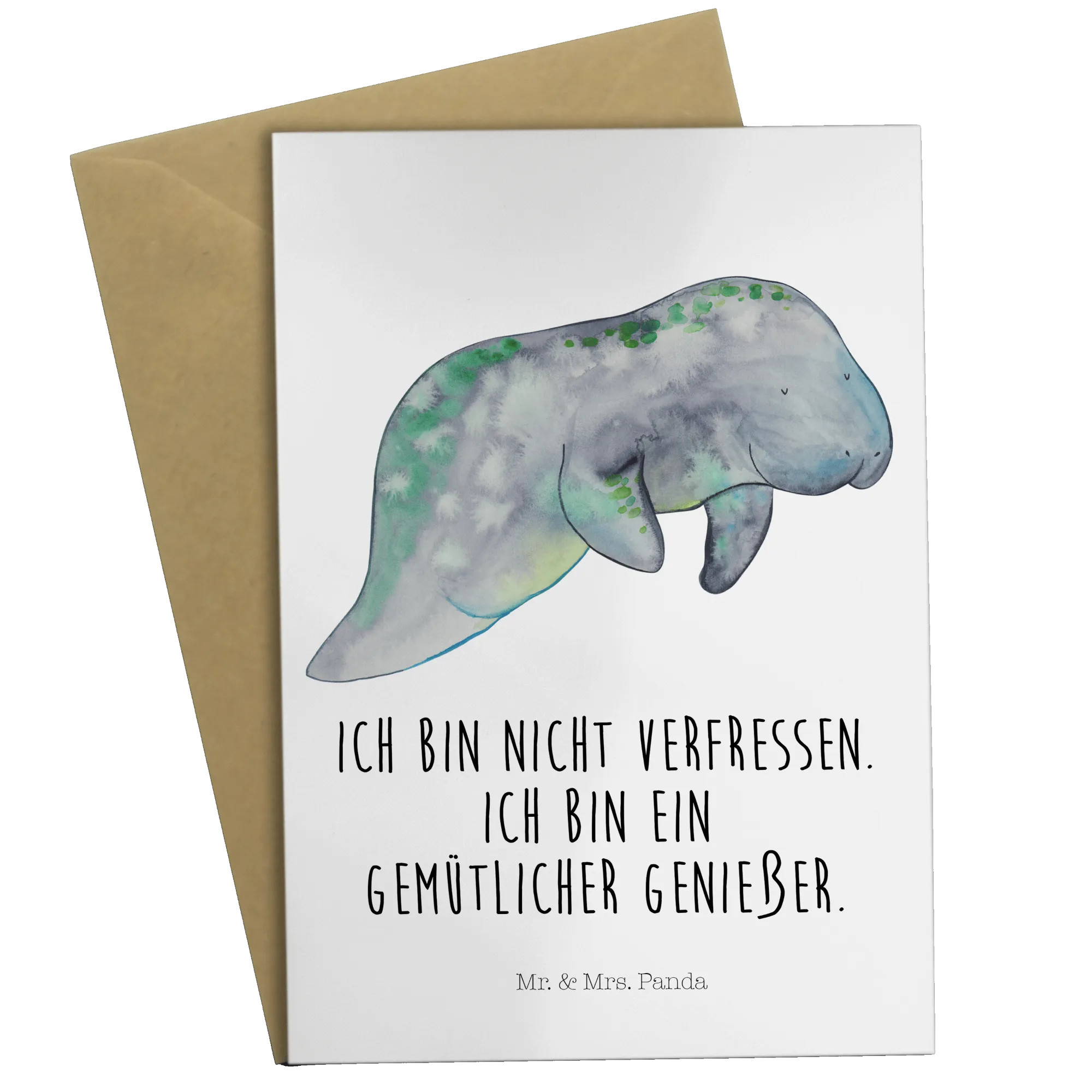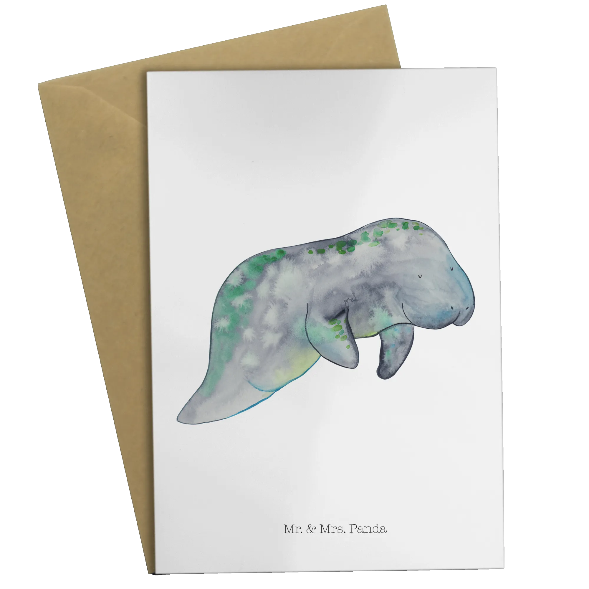 Crafted from high-quality 300-gram cardboard, the card features a stunning hand-drawn watercolor illustration of a peaceful manatee, surrounded by soft blue and green hues that evoke the tranquil beauty of the ocean. This serene sea creature embodies relaxation, making it an ideal complement to your warm wishes. The vibrant greens on the manatee’s back provide a delightful pop of color, creating a visually pleasing piece that is sure to brighten anyone's day.