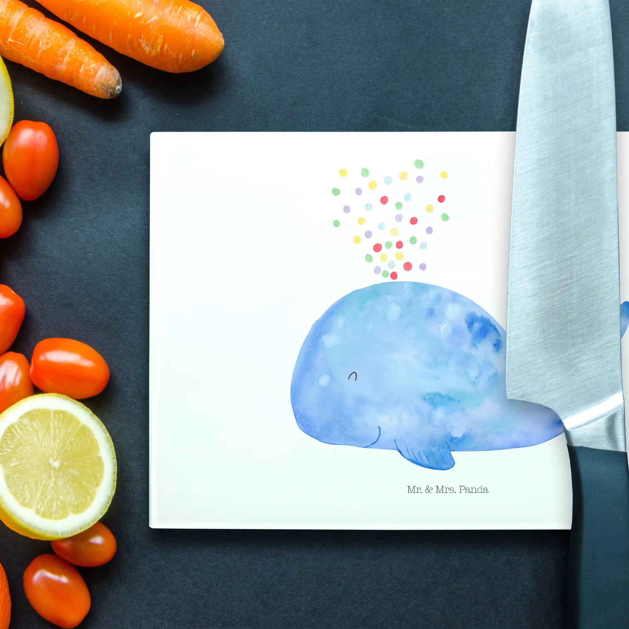 Introducing the delightful Glass Cutting Board with the charming whale confetti design from the Mr. & Mrs. Panda marine animal collection! This one-of-a-kind glass cutting board is not just a kitchen essential, but a heartwarming addition to any home. Cleverly designed for seafood lovers and those embarking on a new beginning, this practical item will be a hit for birthdays, housewarming parties, or even as a motivational gift for someone starting a diet or a new life chapter.