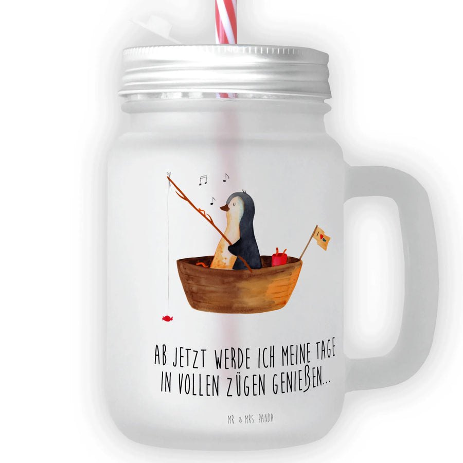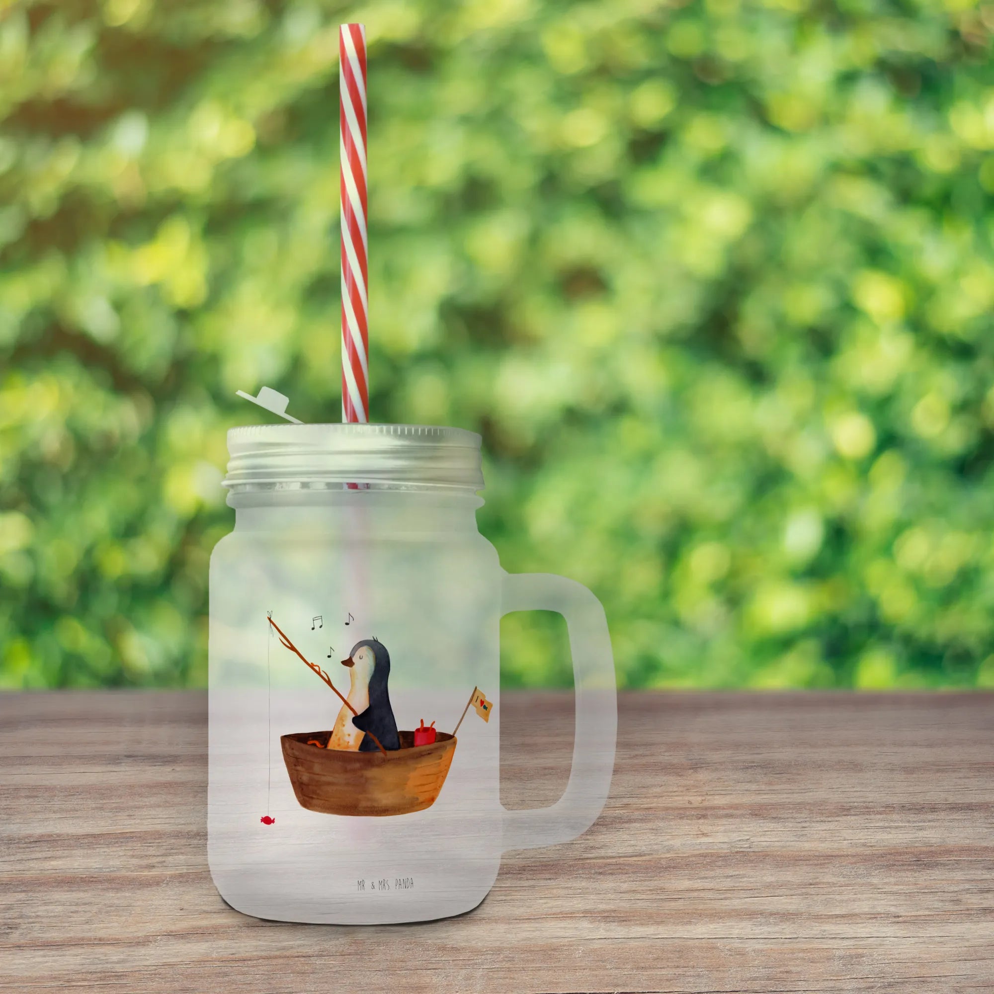 Mason jar drinking glass Penguin fishing boat - with a saying