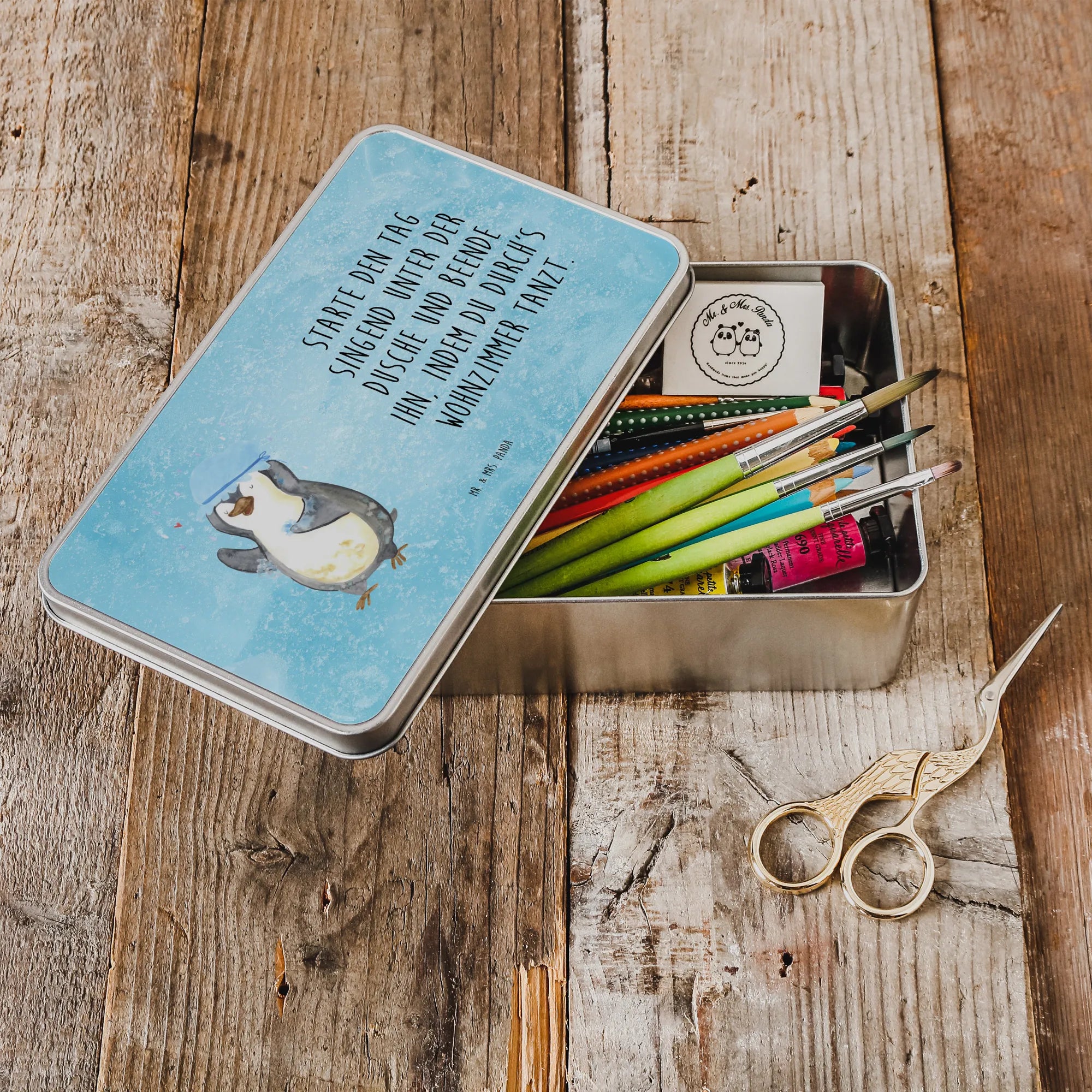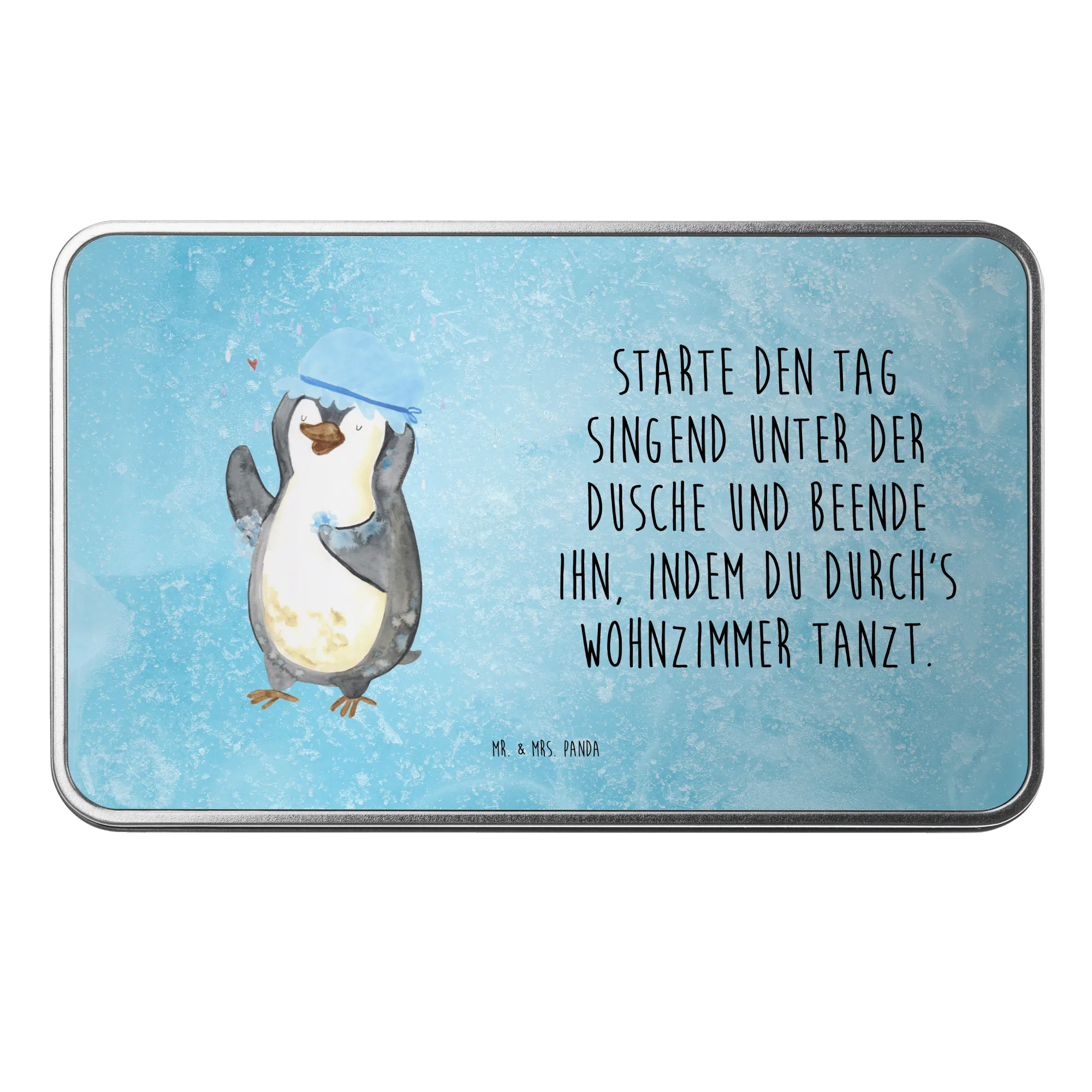 If you're looking for the perfect gift that combines cuteness, functionality, and a dash of joy, look no further than the Mr. & Mrs. Panda Metal Tin featuring our adorable penguin motif! This unique tin box, beautifully printed with a delightful illustration of a penguin joyfully showering, is not just a regular storage solution; it's a burst of happiness that fits perfectly in any home.