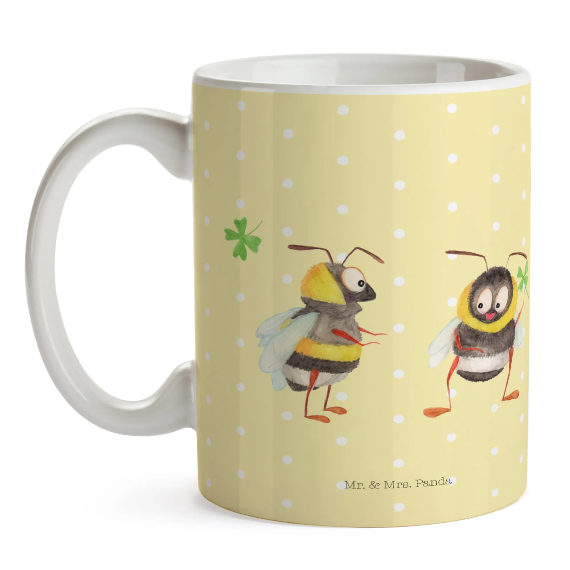 Introducing the delightful Mr. & Mrs. Panda ceramic mug featuring an enchanting motif of adorable bumblebees with clover from our beloved Small World collection! At Mr. & Mrs. Panda, we believe that every sip should bring a smile, and this mug does just that. Crafted from high-quality ceramic, this mug holds 325 ml (11 oz) of your favorite coffee, tea, or any delightful beverage you can imagine!