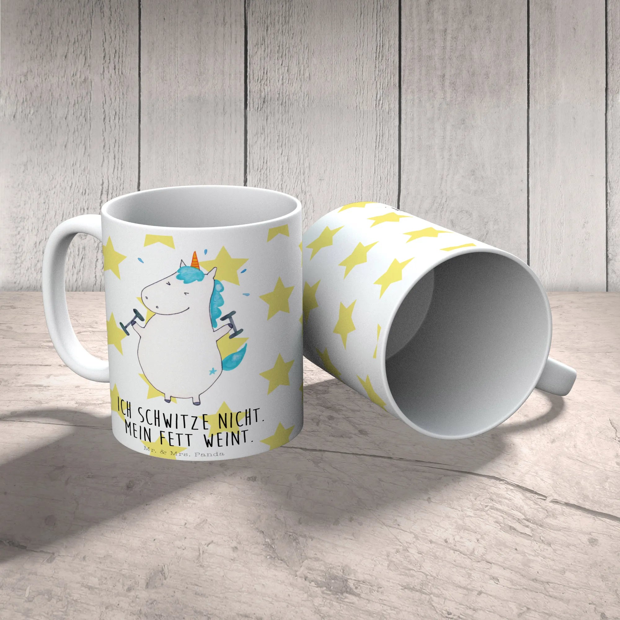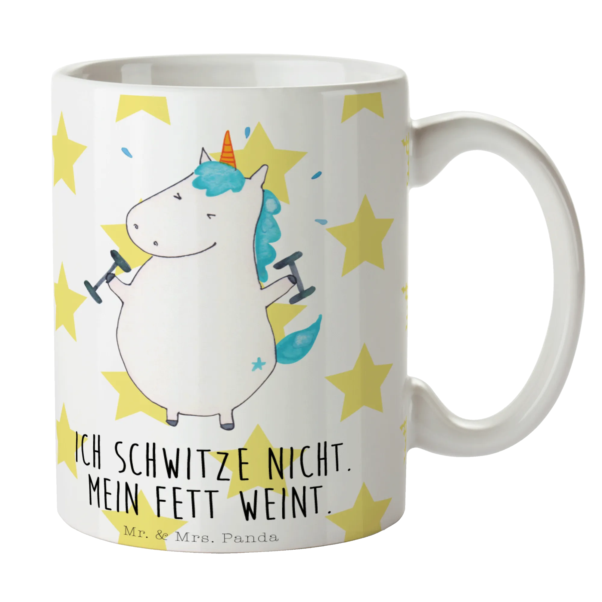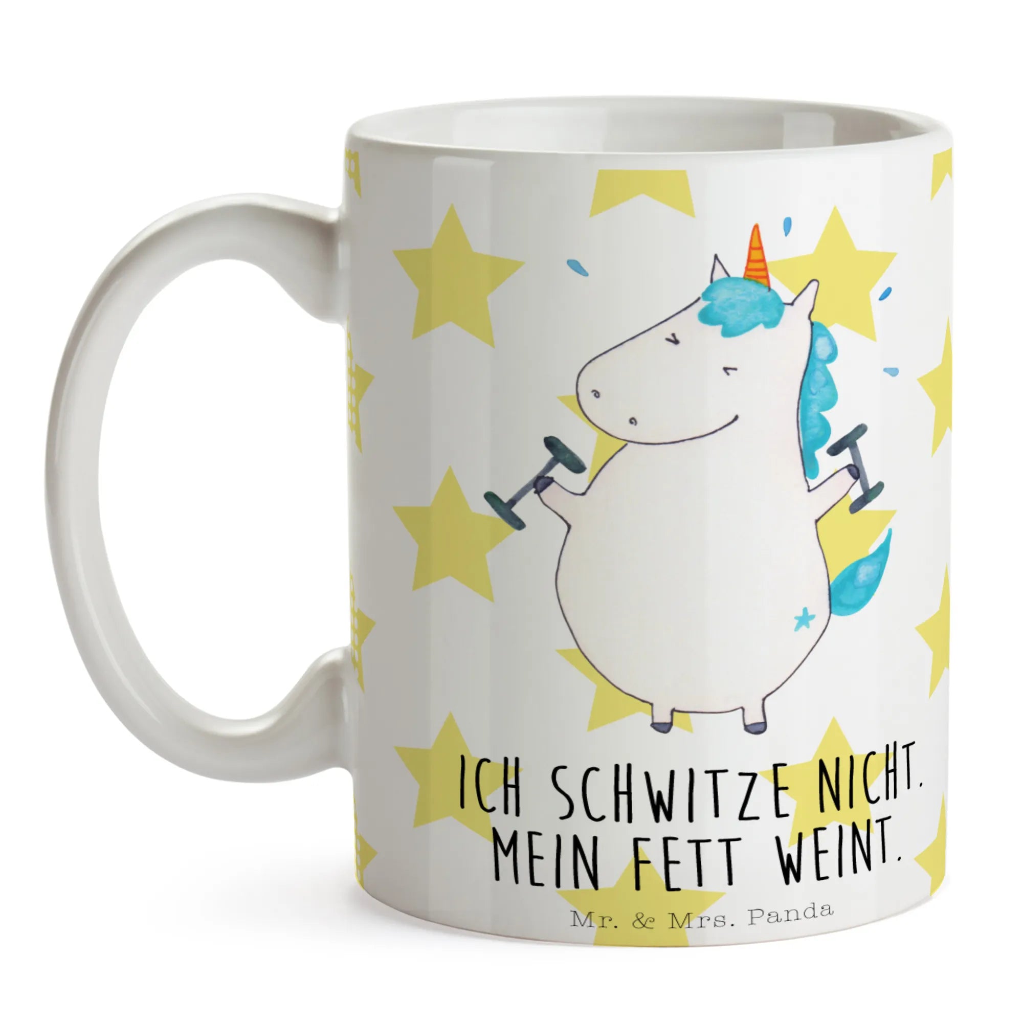 Are you on the lookout for the perfect gift that brings a sprinkle of magic to every morning? Look no further than the enchanting Mr. & Mrs. Panda Unicorn Muscle Mug! This delightful ceramic masterpiece is not just a mug; it's a whimsical companion for anyone who believes in the power of unicorns and the importance of a fit lifestyle. The unique design features a charming unicorn lifting two dumbbells, embodying strength and fun in the gym. With a playful twist, our mug sends a humorous message with the slogan, "Ich schwitze nicht. Mein Fett weint." This translates to "I don't sweat. My fat cries," making it the perfect motivational piece for anyone on a fitness journey.