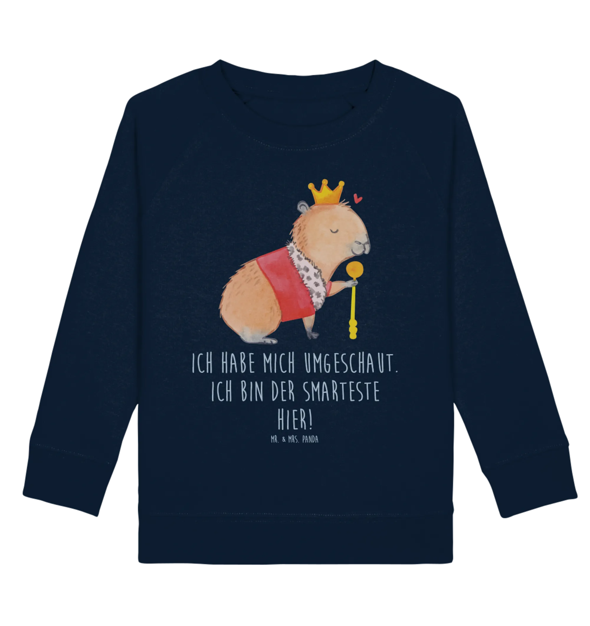 Meet the delightful Capybara King—a symbol of calm and wisdom! Dressed in a sparkling golden crown and a striking purple cloak with a fluffy white collar, he embodies peaceful royalty. With eyes gently closed, he radiates contentment while grasping a golden scepter tightly, exuding warmth. The floating heart signifies his loving nature. Embracing his mantra, 'Ich habe mich umgeschaut. Ich bin der Smarteste hier!' – a charming reassurance that wisdom dwells within us all, waiting to be acknowledged and celebrated.