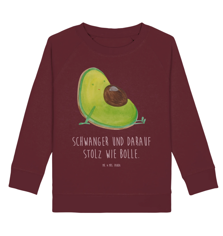 Die süße Avocado, die auf ihrem dicken Kern sitzt, symbolisiert die Freude und Liebe, die eine neue Familie erwartet. Die Kombination aus burgundrot und dem liebevollen Avocado-Motiv sorgt dafür, dass der Pullover sowohl in der Baby- als auch in der Kleinkinder-Garderobe zum absoluten Hingucker wird!