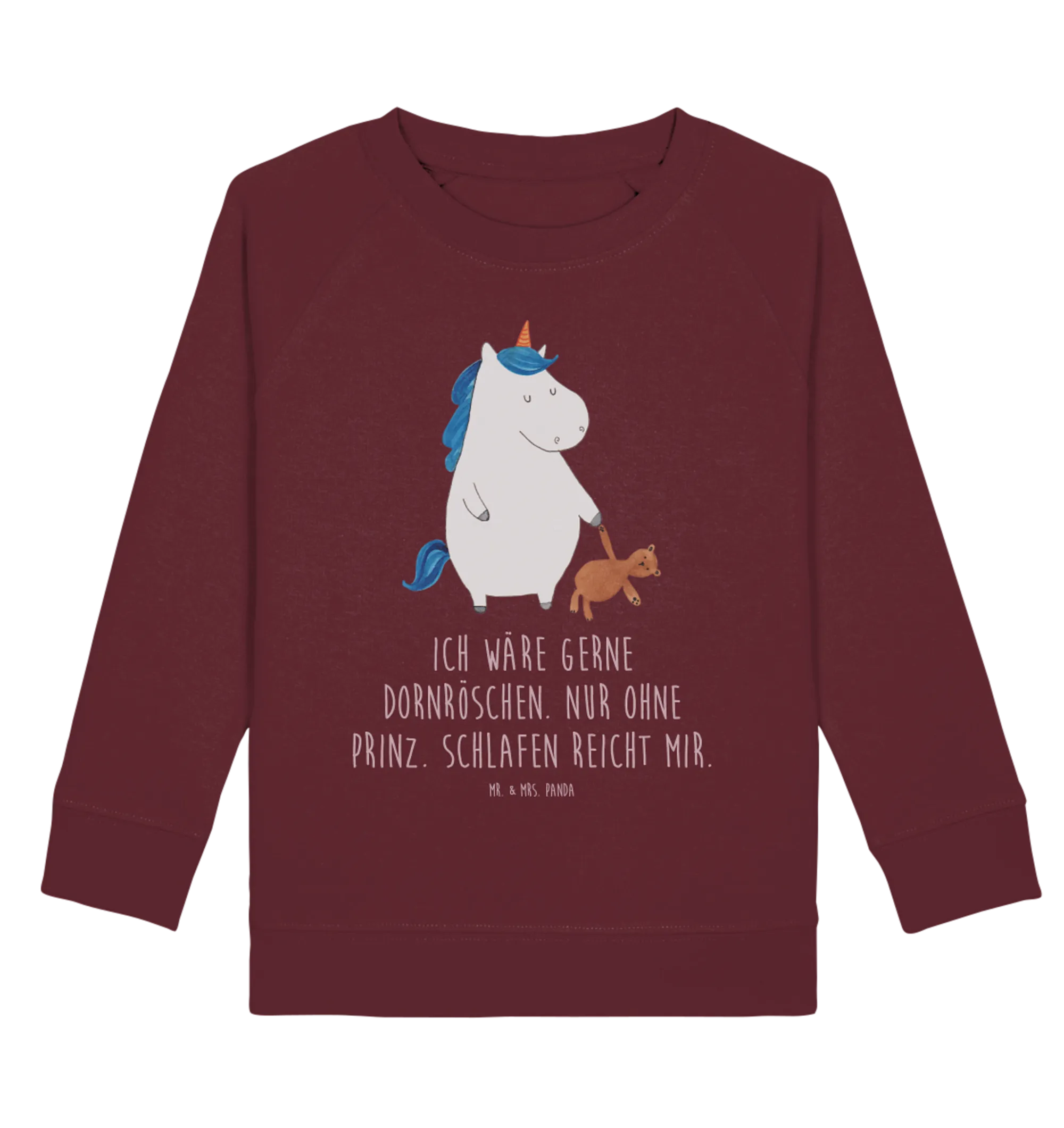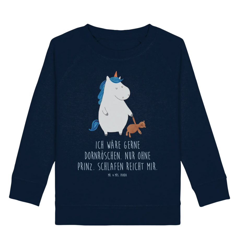 Der Organic Kinder Pullover mit dem zauberhaften Einhorn Teddy aus der Einhorn-Kollektion von Mr. & Mrs. Panda ist das perfekte Geschenk für kleine Einhorn-Fans und Träumer! Jedes Kind liebt die magische Welt der Einhörner, und dieses Shirt vereint Stil, Komfort und eine Botschaft, die alle kleinen Herzen höher schlagen lässt. Der Pullover zeigt ein niedliches, verschlafenes Einhorn, das seinen Teddy festhält und mit dem Slogan "Ich wäre gerne Dornröschen. Nur ohne Prinz. Schlafen reicht mir." gestaltet ist.