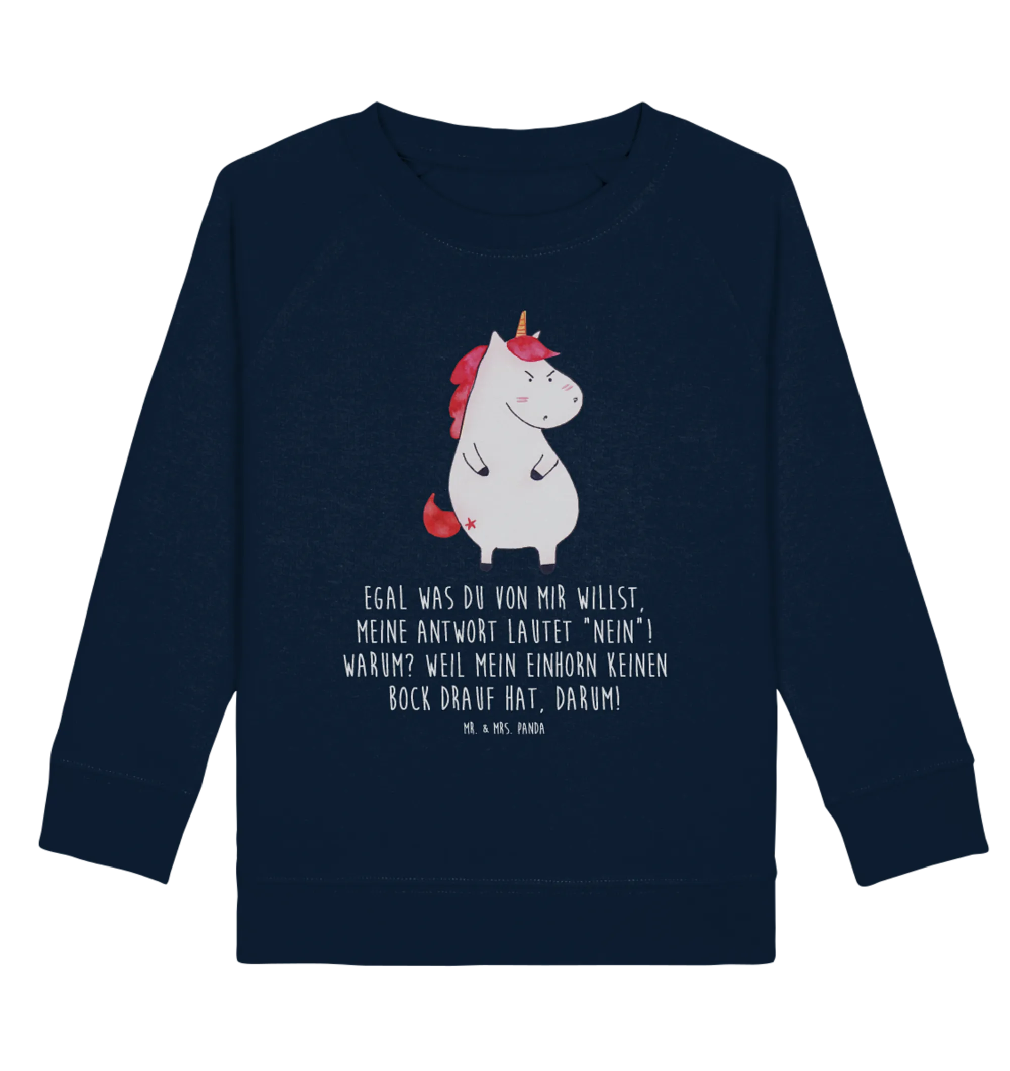 Das niedliche, handgezeichnete Motiv zeigt ein Einhorn, das seine Wut über dumme Fragen auf die lustigste Weise ausdrückt. Der Spruch „Egal was du von mir willst, meine Antwort lautet 'Nein'! Warum? Weil mein Einhorn keinen Bock drauf hat, darum!“ spricht für sich. Die Kombination aus humorvollem Design und hochwertiger, ökologischer Baumwolle macht diesen Pullover zu einem Muss für jeden kleinen Einhorn-Fan.