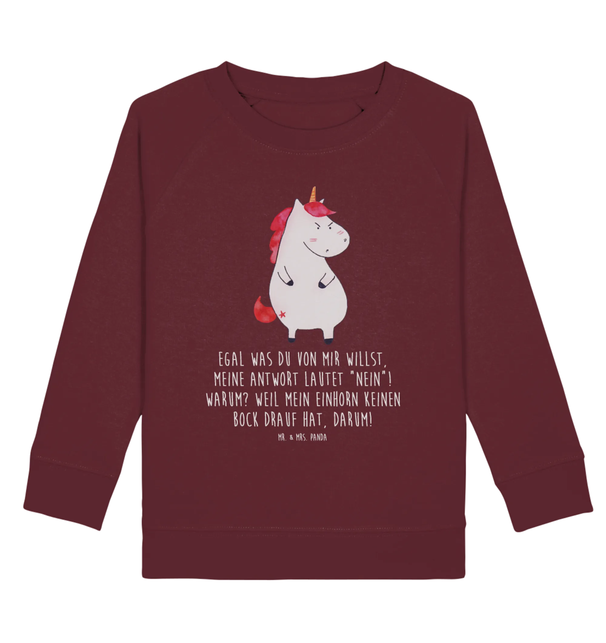Der Organic Kinder Pullover mit dem wütenden Einhorn ist das perfekte Geschenk für kleine Einhorn-Liebhaber! Ob für Jungen oder Mädchen, dieser Pullover bringt ein Lächeln ins Gesicht und ist gleichzeitig ein klarer Ausdruck von Individualität und Humor. Das niedliche, aber auch wütende Einhorn-Motiv sorgt jederzeit für Lacher und hat eine wichtige Botschaft: 'Egal was du von mir willst, meine Antwort lautet Nein! Warum? Weil mein Einhorn keinen Bock drauf hat, darum!'