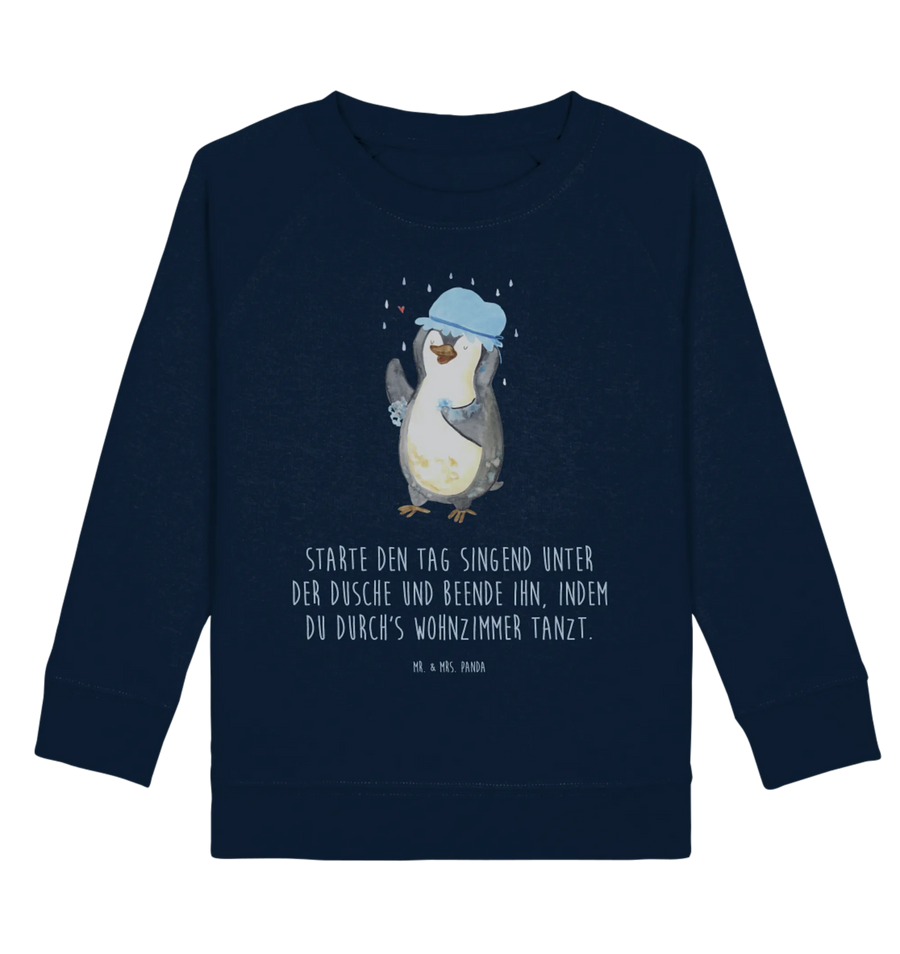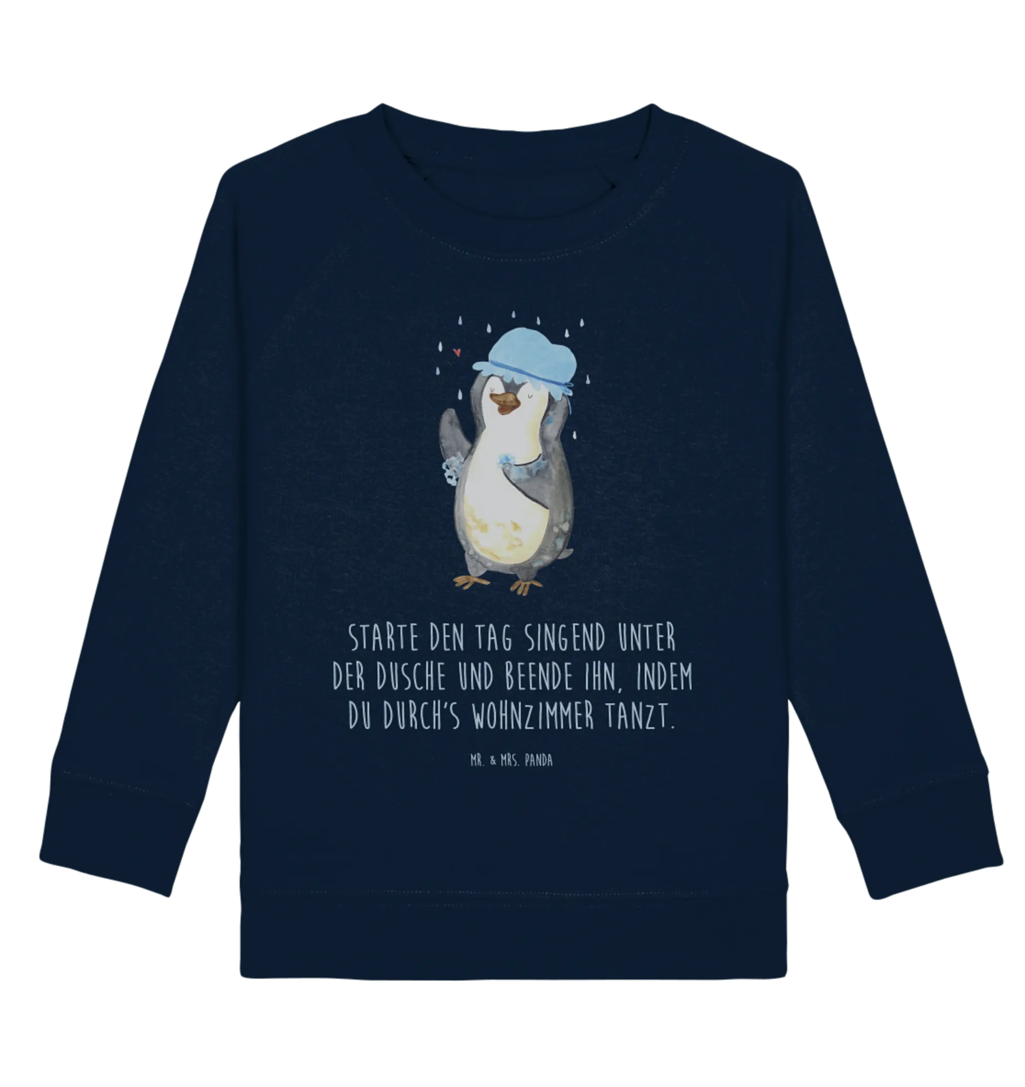 Der Organic Kinder Pullover mit dem bezaubernden Motiv 'Pinguin duscht' aus der Pinguin-Kollektion von Mr. & Mrs. Panda ist der perfekte Begleiter für kleine Entdecker und Abenteurer. Mit diesem vielfältigen Kinder Sweatshirt bringst du ein Stück Freude und Farbigkeit in den Alltag deines Kindes. Der witzige Pinguin, der fröhlich unter dem Regenschauer steht und eine Duschhaube trägt, zaubert ein Lächeln auf jedes Gesicht.