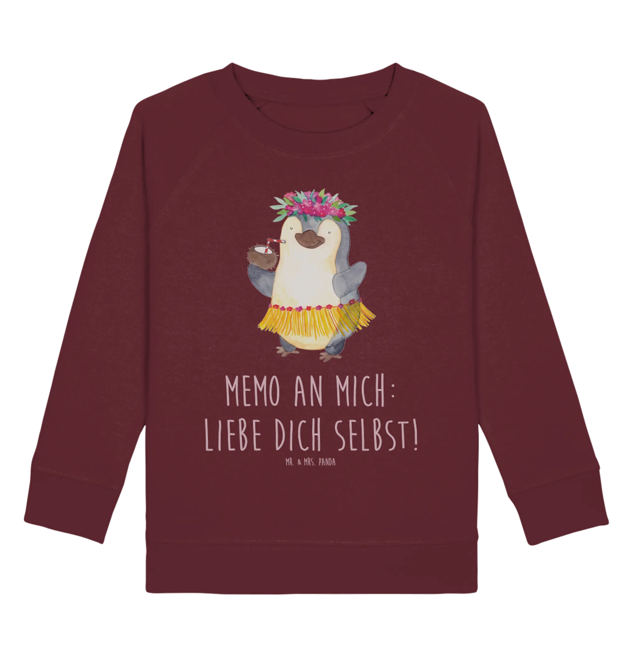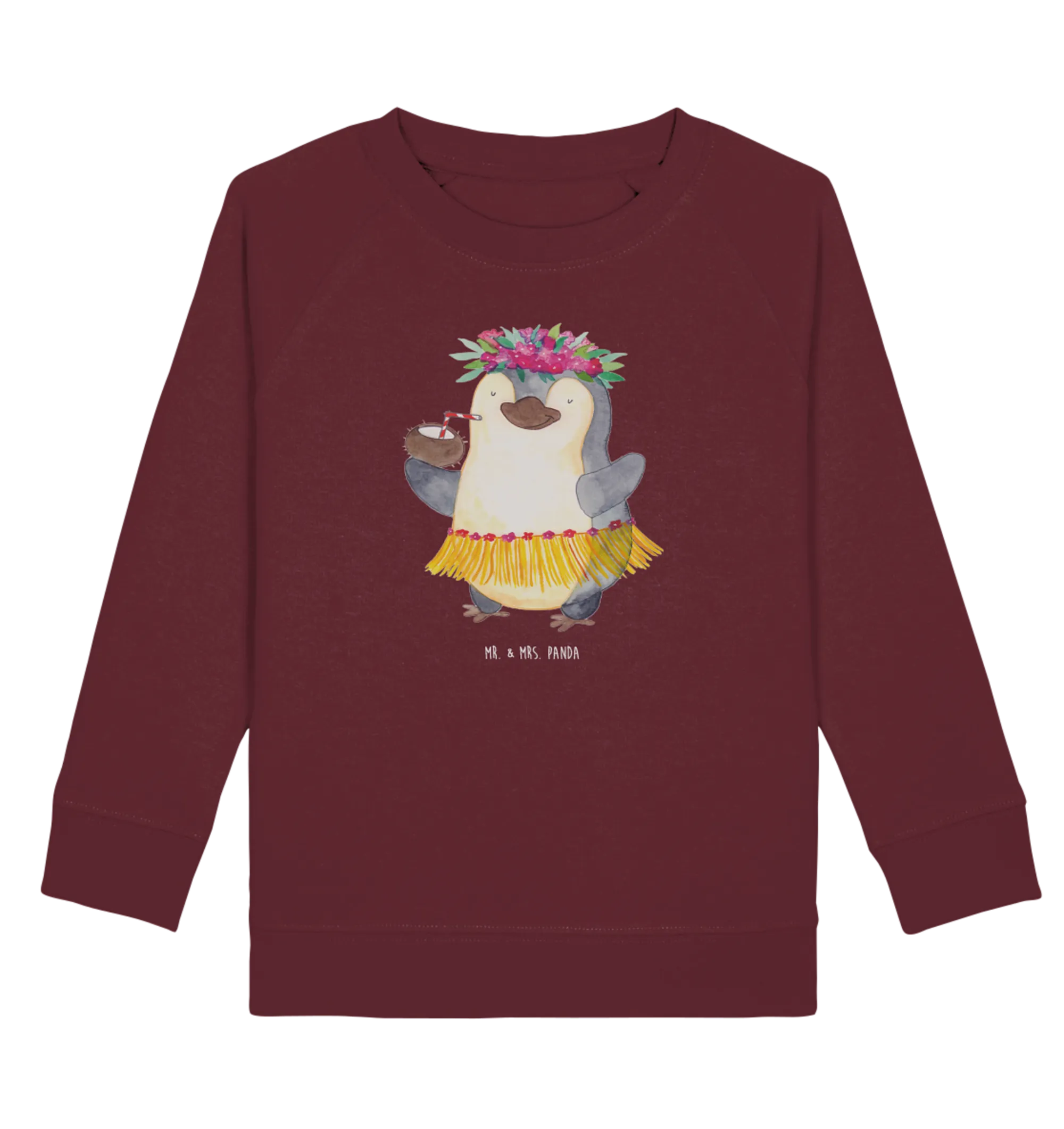 Organic Kinder Pullover „Pinguin Kokosnuss“ – Ein fröhlicher Begleiter für kleine Abenteurer aus der Pinguin - Kollektion von Mr. & Mrs. Panda. Der süße Pinguin mit Röckchen und einer Kokosnuss mit Strohhalm tanzt in der Sonne und verbreitet sofort gute Laune. Der elegante burgunderrote Hintergrund macht den Pullover zugleich besonders und alltagstauglich.