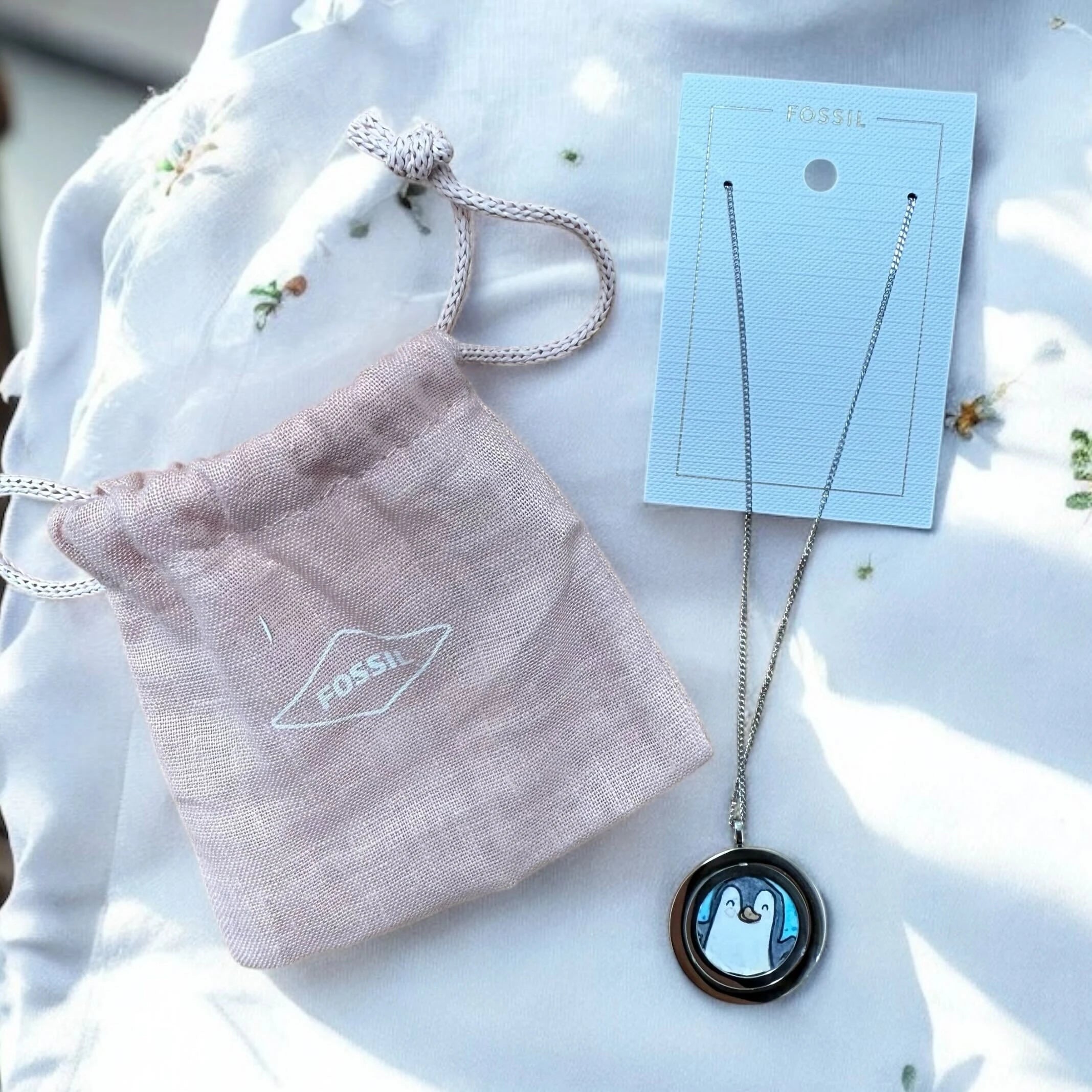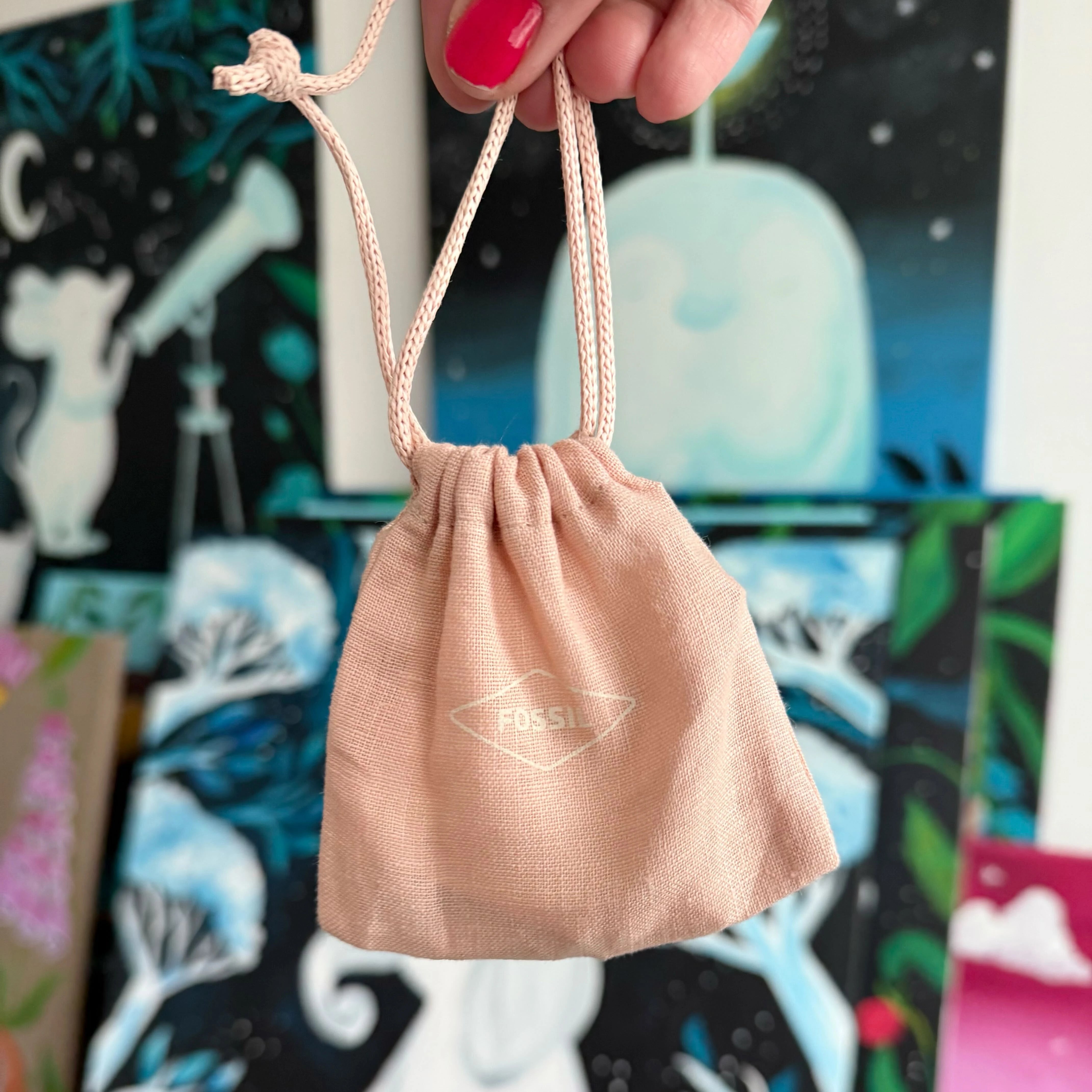 >Eine Halskette der Marke Fossil mit einem Baumwollsäckchen