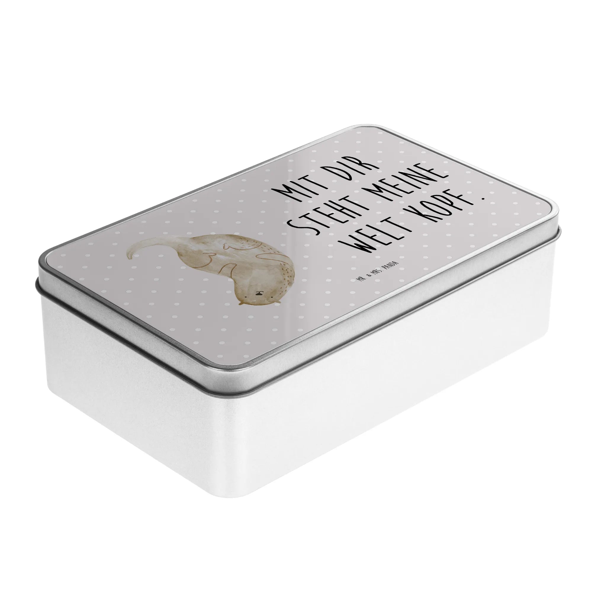 The adorable otter design depicts the lovable water mammal in a playful, upside-down position, bringing a sense of joy and whimsy to any setting. Perfect for storing cookies, sweets, or even little treasures, this charming tin makes a wonderful gift idea for birthdays, holidays, or simply to show someone that you care. The slogan "You turn my world upside down" makes this tin even more special and personal.