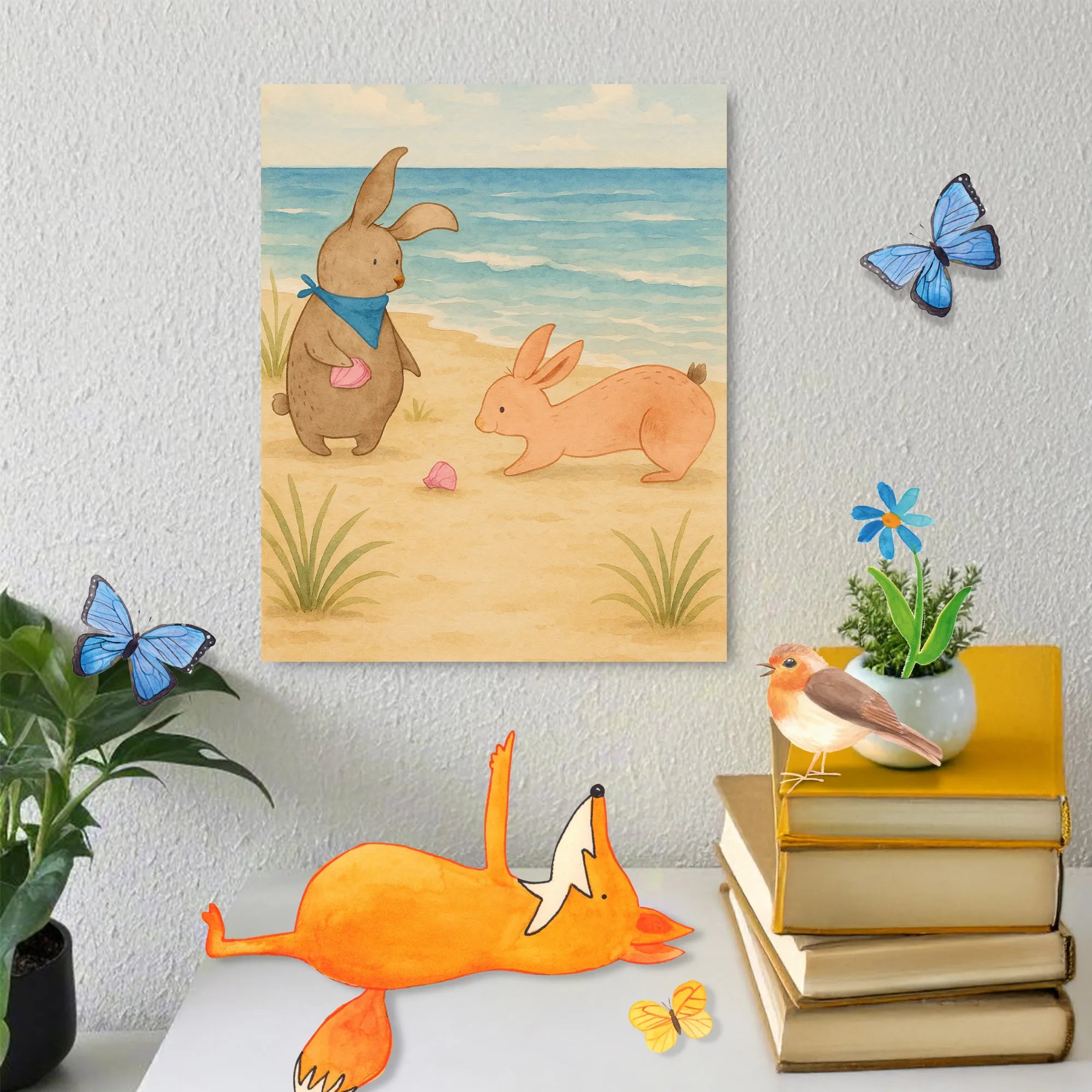 Stell dir vor, zwei süße Hasen genießen gemeinsam einen Tag am Meer. Auf diesem bezaubernden Motiv steht der linke Hase auf seinen Hinterbeinen, trägt ein fröhlich blauen Halstuch um den Hals und betrachtet mit einem neugierigen Blick eine zarte, rosafarbene Muschel. Der rechte Hase hingegen liegt entspannt auf dem Boden und streckt seine kleinen Pfoten nach der Muschel aus, als wäre sie ein wertvoller Schatz. Die warmen, sanften Farben vermitteln eine friedliche, freundliche Stimmung, die zum Träumen einlädt. Hier zeigen die Hasen ihre Freundschaft auf eine ganz besondere Art und Weise. Bei einem Spaziergang am Meer, bei dem Muscheln gesammelt werden, kommen die besten Freundinnen zusammen, um wertvolle Momente zu teilen und das aufregende Abenteuer des Lebens zu genießen. Die Darstellung dieser beiden Hasen erinnert uns daran, wie wichtig Freundschaft ist, ganz gleich ob am Strand oder irgendwo in der Welt. Dieses Motiv symbolisiert das Geheimnis unseres Lebens und der Heldentaten, die wir mit unseren besten Freunden erleben; zeitlos und voller Liebe.