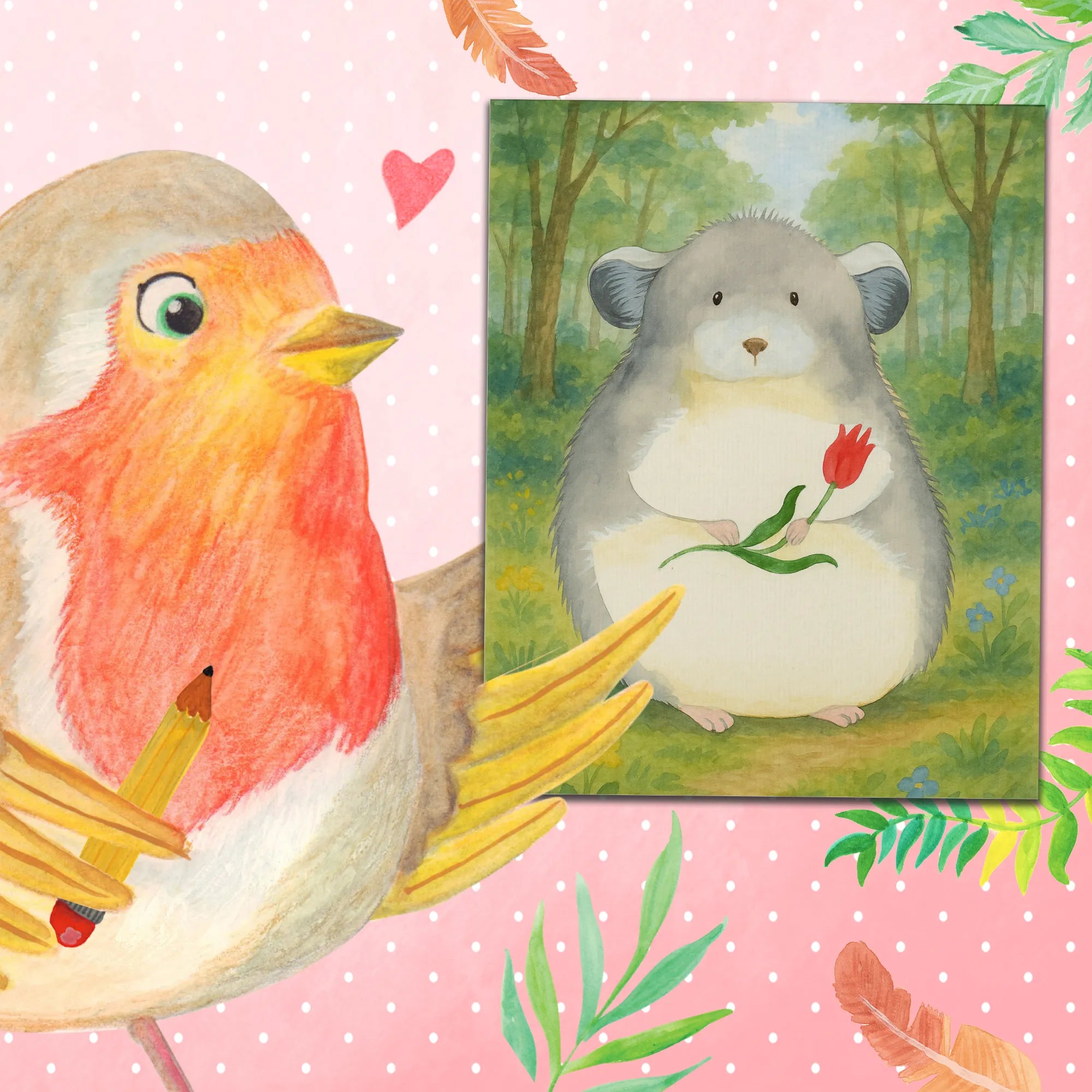Das entzückende Chinchilla mit seiner Blume steht wie ein fasziniertes Wesen da. Es lädt uns ein, einen Moment innezuhalten und über die kleinen Freuden des Lebens nachzudenken. Manchmal ist das Leben chaotisch und die Gefühle spielen verrückt: Liebeskummer schleicht sich an und der Büroalltag lässt uns müde werden. Doch dieses kleine Tier zeigt uns, dass die Schönheit des Lebens in den kleinen Details liegt. Auch wenn wir traurig sind oder mit Kummer kämpfen, erinnert es uns daran, dass wir die Fähigkeit haben, wieder glücklich zu sein. Der Anblick des Chinchillas zaubert uns ein Lächeln ins Gesicht und hilft uns zu verstehen, dass sogar die ungewöhnlichsten kleinen Freunde eine positive Wendung in unser Leben bringen können. Es ist wunderschön, wie ein kleiner Moment uns daran erinnern kann, unser Herz für das Glück zu öffnen.