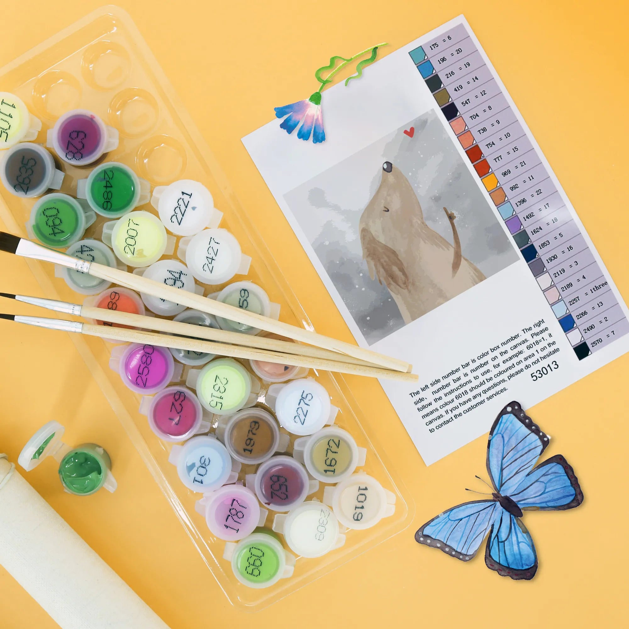 Our Paint by Numbers is designed to ignite creativity in everyone, from beginners to seasoned artists. With 24 vibrant, high-quality acrylic paints included, painting becomes a relaxing activity that you can dive into alone or with loved ones. The "Dog Love" image is a charming portrayal of a sweet dog expressing love with a little heart, making it a fantastic decorative item for any pet owner’s home.