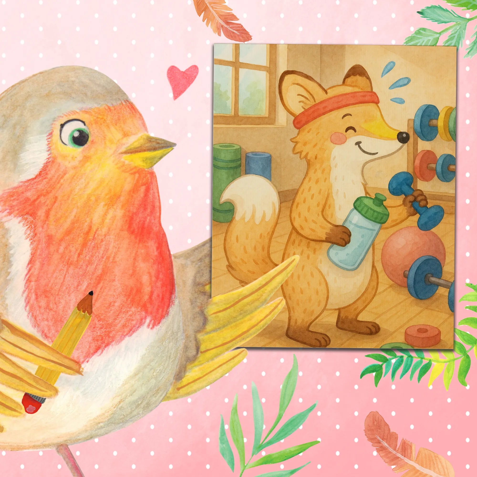 Hier kommt unser süßer Fuchs direkt vom Sportpark! Mit einer Hantel in der Hand und einer Trinkflasche in der anderen bringt er sein Fitnessprogramm auf das nächste Level. Schweißperlen laufen über sein Gesicht, aber er lacht und hat Spaß dabei! Sein Motto ist klar – Sport treiben soll Freude machen! Egal ob im Sportclub, im Fitnessstudio oder draußen in der Natur, er liebt jede Minute. Mit seinem unermüdlichen Einsatz erinnert er uns daran, wie wichtig es ist, aktiv zu sein und sich wohlzufühlen. Lass uns alle ein bisschen von seiner Motivation und seinem Elan abbekommen und zusammen Spaß am Sport haben!