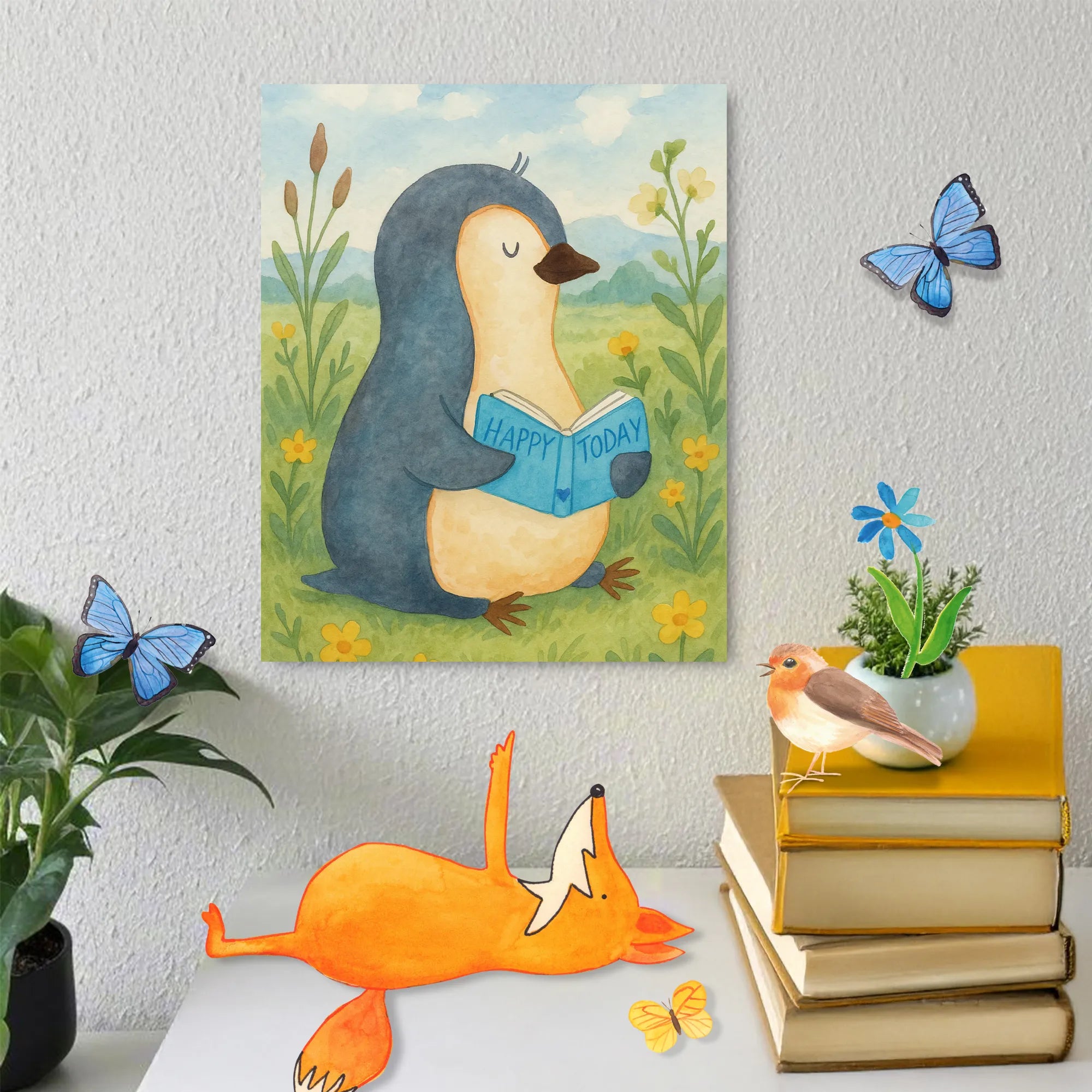 In einer erfrischenden, kalten Umgebung, wo der Wind leise pfeift und die Sonne milde strahlt, findest du unseren kleinen Pinguin. Mit einem Buch in seinen Flügeln und einem großen Traum in seinem Herzen ist er bereit, in ferne Länder zu reisen. Er hat es sich in seiner kleinen Eis- und Schneewelt gemütlich gemacht und genießt die Zeit ganz für sich – nur er und seine Geschichten. In einer Welt voller Spiel und Spaß um ihn herum verkörpert er das pure Glück des Faulenzens. Seine Fantasie ist sein größter Reiseführer, und in den Seiten seines Buches entdeckt er unzählige Abenteuer. Mit diesem Motiv möchten wir dich daran erinnern, wie wertvoll es ist, Zeit für sich selbst zu nehmen, um in die Welt der Bücher einzutauchen und auch mal nichts zu tun. Lass dich von diesem kleinen, gemütlichen Pinguin inspirieren und finde deinen eigenen Ruheplatz zum Lesen und Entspannen.