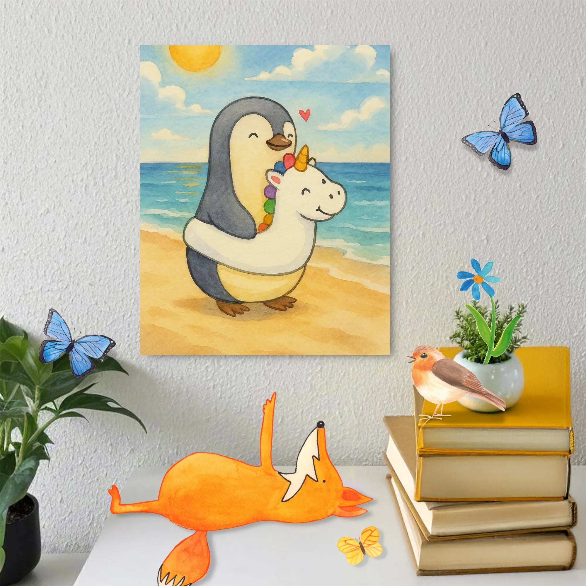 Let’s take a little peek into a world of joy and laughter, where a charming penguin is snagged in a delightful moment with an enchanting unicorn swimming ring. With its dazzling colors and playful charm, this ring isn’t just for floating; it’s a portal to fun! The penguin, snugly wrapped around its buddy, exudes happiness with every wave of its flipper. A heart in the corner adds a dollop of love, reminding us that joy is meant to be shared. This scene tells us it’s okay to play, laugh, and dance like nobody’s watching. With every glance, this motif invites you to remember the wonders of your childhood and to keep that adventurous spirit alive. It’s all about treasuring those golden moments that make life beautifully vibrant!
