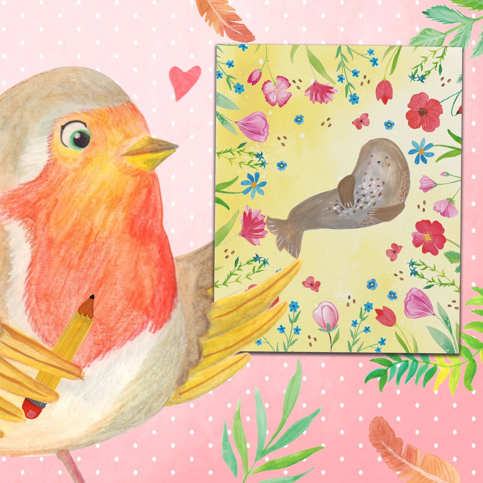 Seals are very cute, peaceful and comfortable animals. They love to lie on the beach in groups and let the sun shine on their fur. The seals were lovingly drawn in watercolour by Mrs. Panda.
