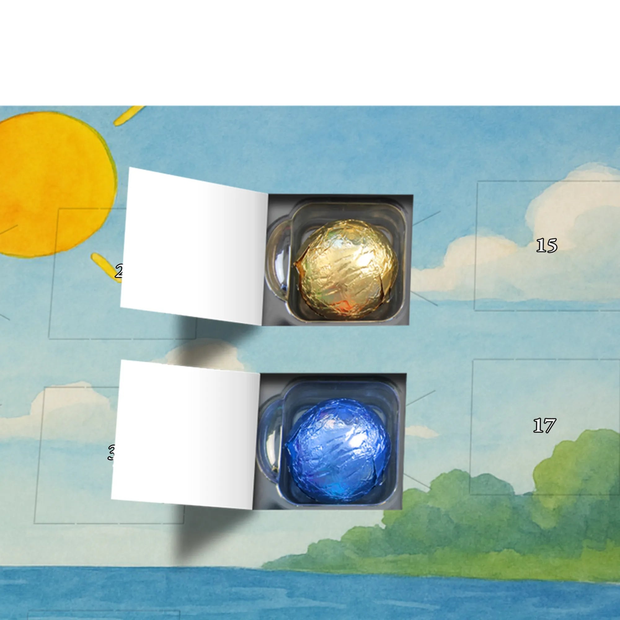 Unser Schokoladen Kalender ist gefüllt mit 24 einzeln verpackten Markenschokoladen Kugeln in drei leckeren Geschmacksrichtungen: Vollmilch, Feinherb und Weiße Schokolade. So genießt du jeden Dezembertag eine kleine süße Überraschung.