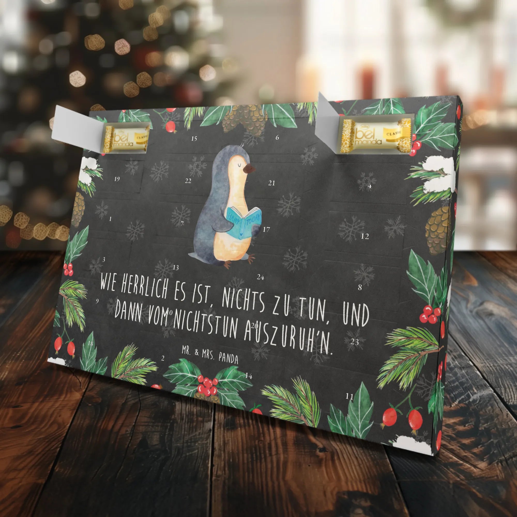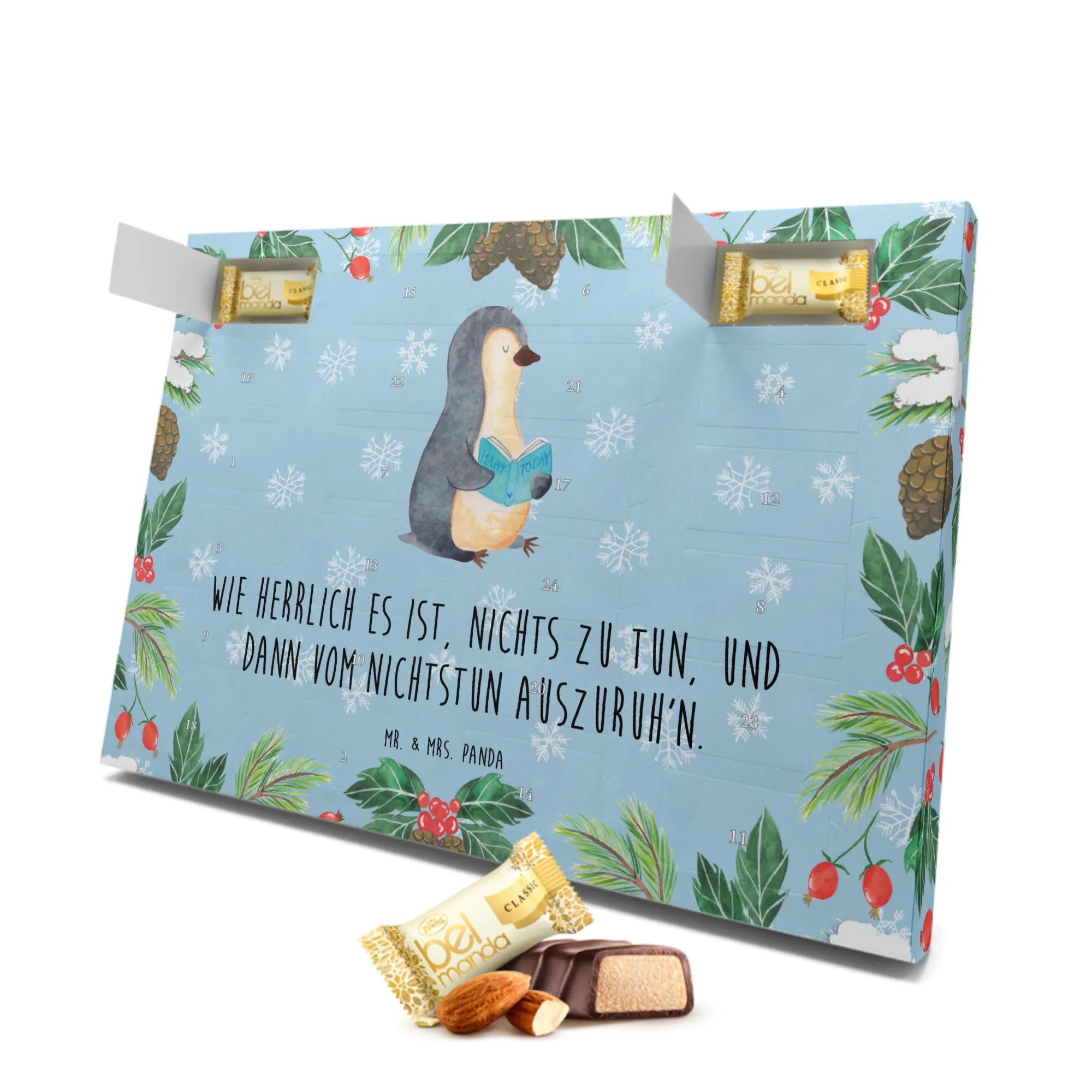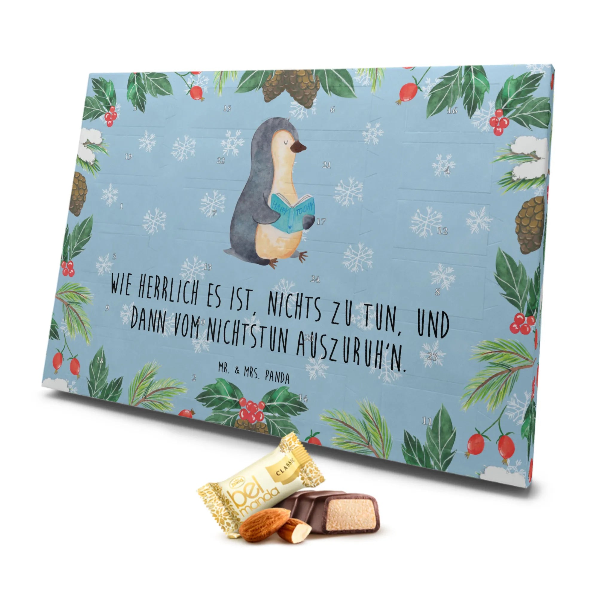 Das liebevoll handgezeichnete Motiv von Mr. & Mrs. Panda zeigt einen kleinen Pinguin, der ganz vertieft in ein spannendes Buch ist. Für alle, die das Lesen lieben, ist dieser Adventskalender ein besonderes Highlight in der Adventszeit. Mit dem Slogan "Wie herrlich es ist, nichts zu tun, und dann vom Nichtstun auszuruh'n" bringt er zudem eine humorvolle Note mit sich.