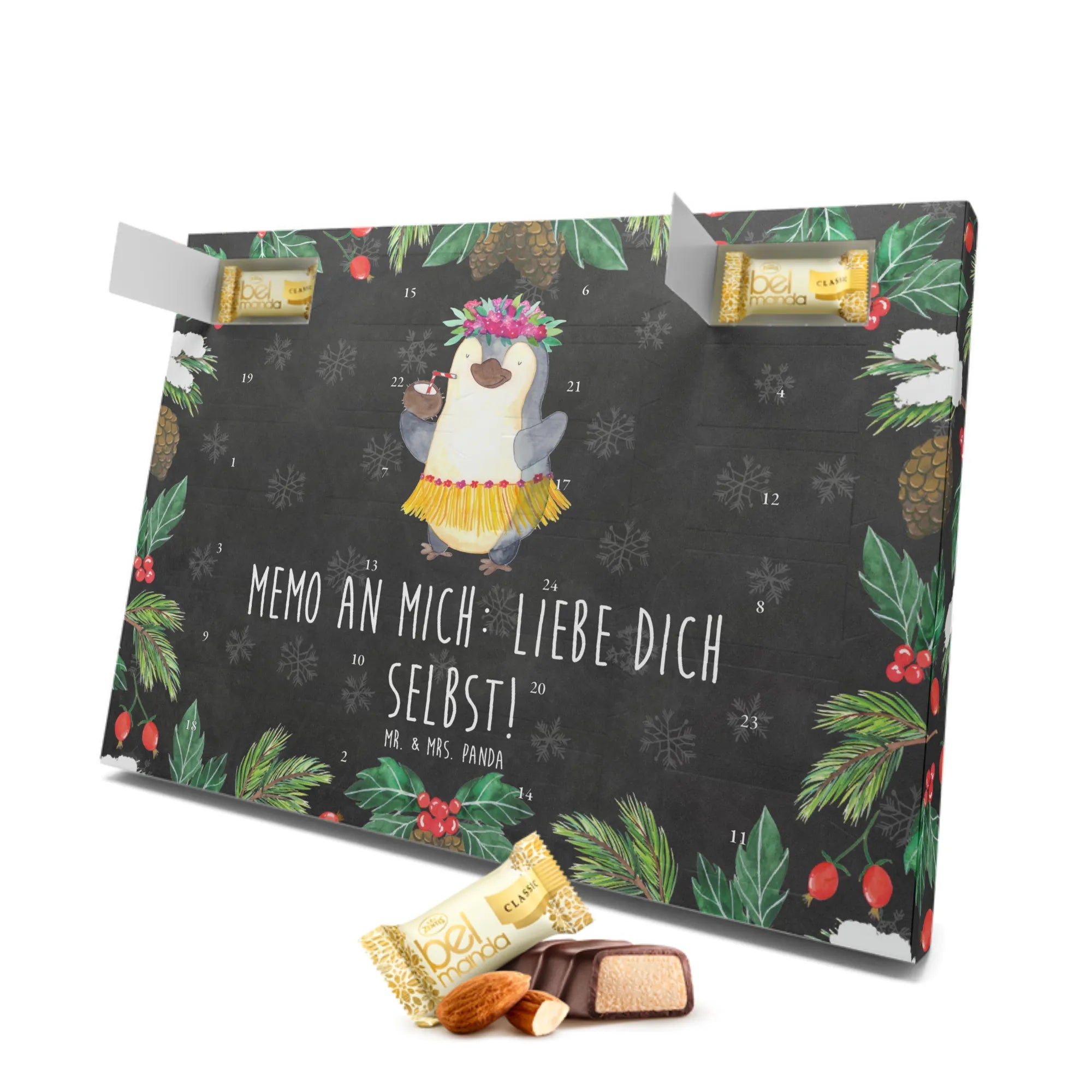 Bereite dir selbst oder deinen Liebsten jeden Tag mit dem Marzipan Adventskalender von Mr. & Mrs. Panda Freude. In einer Größe von 325 mm x 225 mm x 27 mm bietet dieser Kalender 24 Tage puren Marzipangenusses. Wunderschöne Illustrationen und inspirierende Sprüche schmücken ihn und machen ihn zu einem wahren Weihnachtsmärchen. Die seidenmatte Oberflächenveredelung hebt die Details der Illustrationen hervor und die bedruckten Seitenflächen verleihen ihm eine edle Note. Ganz nach Wunsch kann der Kalender aufgehängt oder aufgestellt werden. Beachte bitte, dass er Spuren anderer Schalenfrüchte enthalten kann. Dieser Kalender ist mehr als nur eine Süßigkeit – es ist ein Erlebnis der Sinne in der Adventszeit.