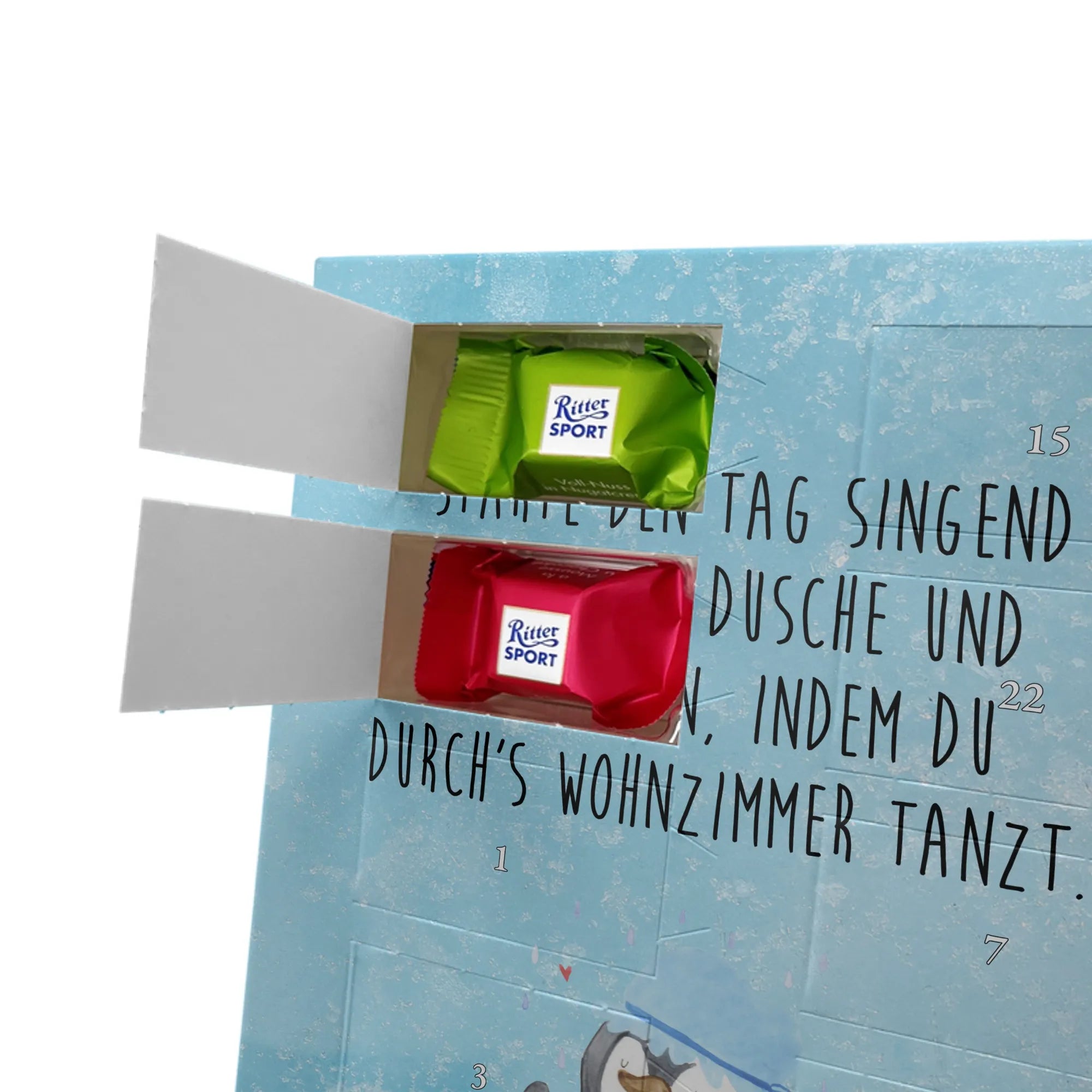 Wunderschöner Personalisierter Schoko Foto Adventskalender von Mr. & Mrs. Panda – das perfekte Geschenk für deine Liebsten! Dieser Adventskalender ist liebevoll gestaltet, bedruckt mit wunderschönen Motiven & Sprüchen von Mr. & Mrs. Panda und personalisierbar mit einem Foto deiner Wahl. Achte bitte auf hohe Auflösung: Lade ein Foto in guter Qualität und ausreichender Auflösung hoch, damit das Druckergebnis klar und brillant wird. Achte auf den richtigen Bildausschnitt, damit keine wichtigen Details abgeschnitten werden. Wir empfehlen, den Kalender-Rahmen vorher anzusehen, um zu wissen, wie dein Foto platziert wird. Lade nur Bilder hoch, bei denen du die Bildrechte besitzt oder die Erlaubnis hast. Die Fotos werden weder aufbereitet noch zugeschnitten. Rücknahme bei personalisierten Foto Artikeln ist ausgeschlossen. Der Kalender besticht durch brillante Druckqualität mit seidenmatter Oberflächenveredelung und bedruckte Seitenflächen. Maße: 325 mm x 225 mm x 27 mm. Besonderheit: Kann aufgehängt oder aufgestellt werden – ganz wie du möchtest. Gefüllt ist der Kalender mit Ritter Sport Schokowürfeln in leckeren Geschmacksrichtungen: Mousse au Chocolat, Schoko Crisp, Voll-Nuss in Nougatcreme, Karamell Duo, Joghurt und Erdbeer-Joghurt. Ein zauberhaftes, persönliches Geschenk, das Vorfreude bereitet und jeden Tag im Advent versüßt!