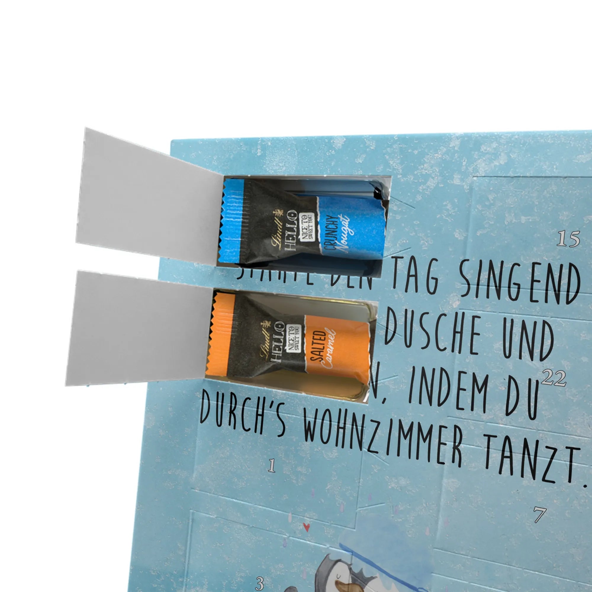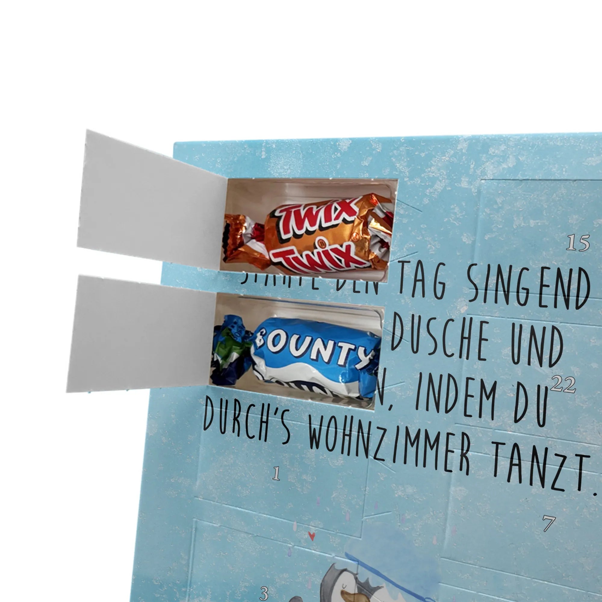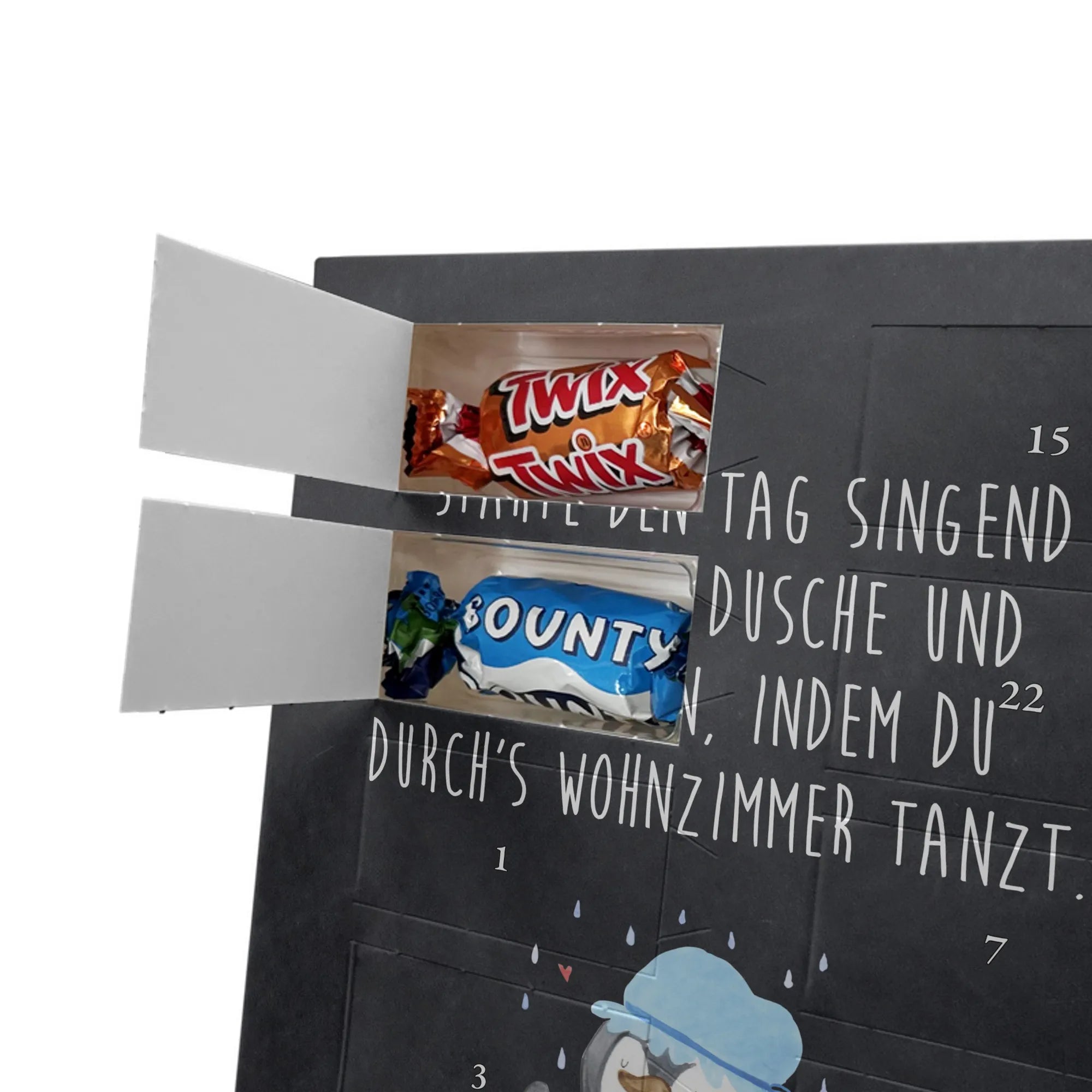 Charmanter Personalisierter Adventskalender mit Schoko-Foto von Mr. & Mrs. Panda – eine liebevolle Art, die Adventszeit zu personalisieren. Der Kalender ist mit den typischen Mr. & Mrs. Panda Motiven und herzlichen Sprüchen bedruckt; du kannst die Vorderseite mit deinem Lieblingsfoto gestalten. Achte auf eine hohe Auflösung deines Fotos, damit das Druckbild schön scharf wird, und kontrolliere den Bildausschnitt, damit keine wichtigen Details verloren gehen. Bitte lade nur Bilder hoch, für die du die Bildrechte besitzt oder eine Erlaubnis zur Nutzung vorliegt. Die Verarbeitung ist hochwertig: brillante Druckqualität, seidenmatte Oberflächenveredelung und bedruckte Seitenflächen für ein rundes Design. Maße: 325 mm x 225 mm x 27 mm. Der Kalender kann aufgehängt oder aufgestellt werden – ganz nach Belieben. Wichtig: Die Fotos werden nicht nachbearbeitet oder zugeschnitten; personalisierte Foto-Artikel sind vom Widerruf ausgenommen. Gefüllt ist der Adventskalender mit Celebrations Schokolade – 24 feine Füllungen in 8 verschiedenen Sorten (Maltesers, Mars, Snickers, Twix, Milky Way, Bounty, Galaxy, Galaxy Caramel). Ein persönliches Geschenk, das Erinnerungen und Genuss wunderbar verbindet.