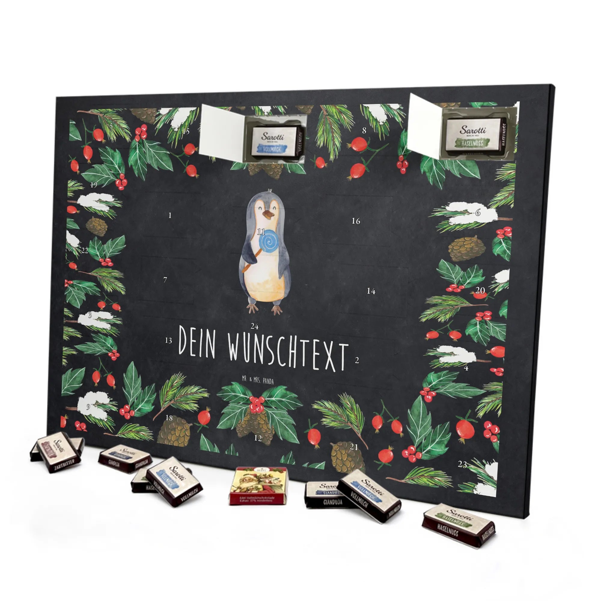 Make the Advent season even more special with the personalized chocolate Advent calendar from Mr. & Mrs. Panda. This unique Advent calendar is printed with your desired name or a custom text and features exclusive designs and sayings from the renowned designer duo. It's not only a visual highlight but also delights taste buds with 24 high-quality chocolate balls in various colors. The brilliant print quality and the silk-matte finish make this calendar a true eye-catcher during the Christmas season.