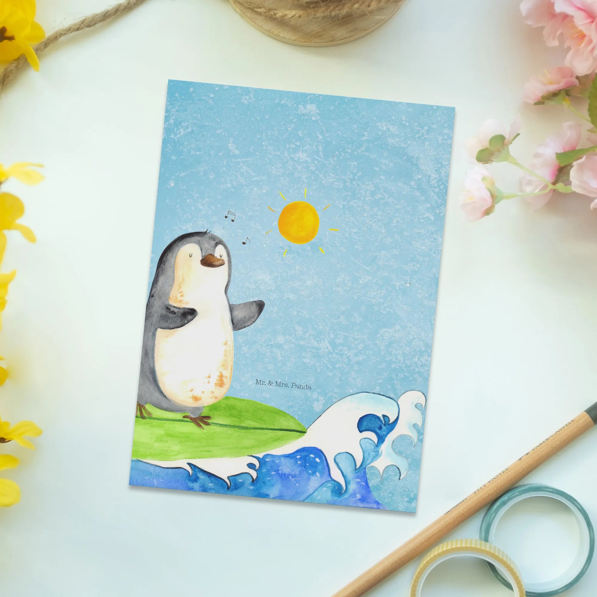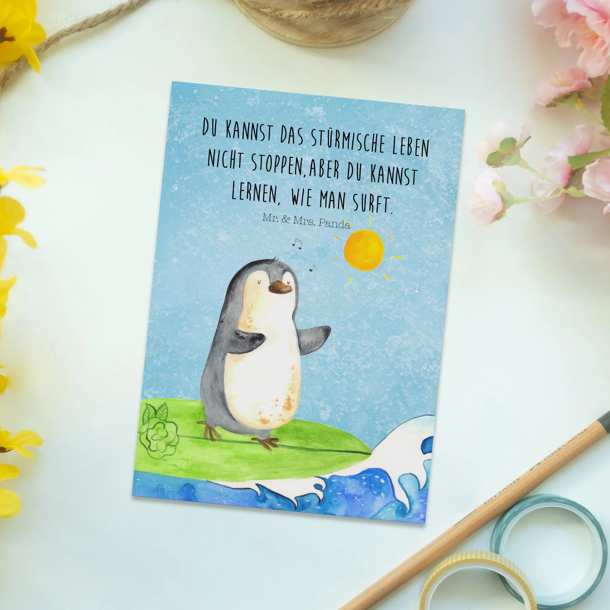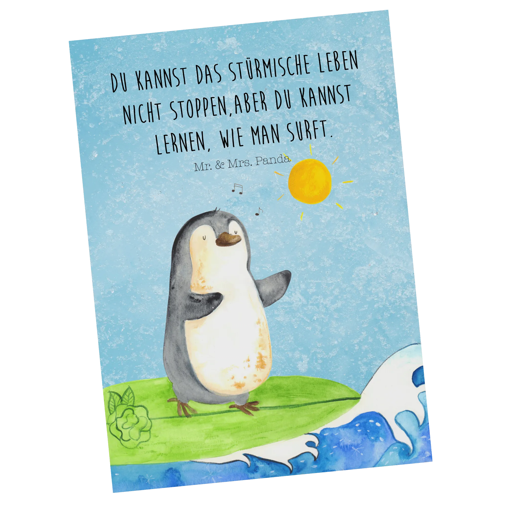 Postcard Penguin surfer - with saying - Ice Blue