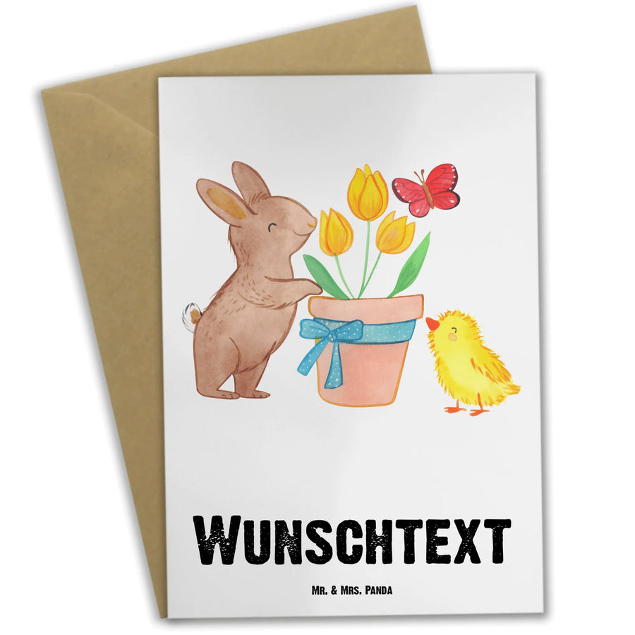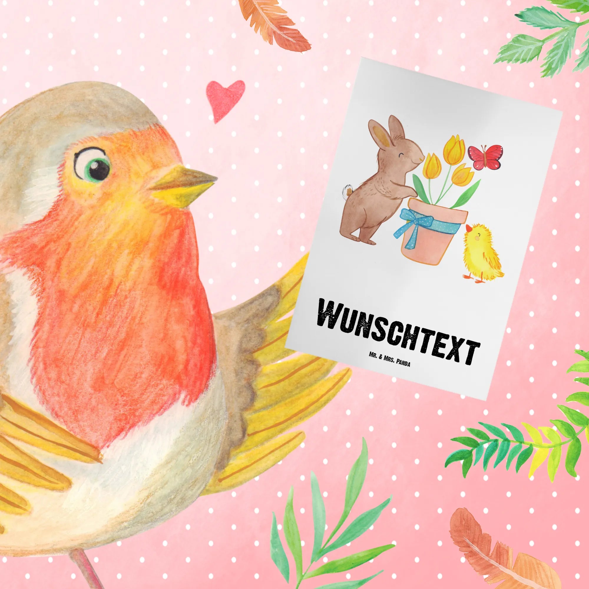 Here we have a charming scene with a happy bunny gently holding a vase of vibrant yellow tulips, brightening up the space with its delightful presence. The vase is dressed in a lovely blue polka-dotted ribbon, making it even more enchanting. An adorable little yellow chick curiously gazes at the tulips, while a vivid red-orange butterfly flutters nearby, creating a perfect representation of the Easter spirit. The soft, warm colors reflect the joy and warmth of this season, encapsulated in our heartwarming slogan: 'Das Schönste an Ostern ist: die bunten Blumen überall, Sonnenschein im Herzen und Frühlingsgefühle im Bauch!' Let this touching imagery fill your heart with happiness this Easter!
