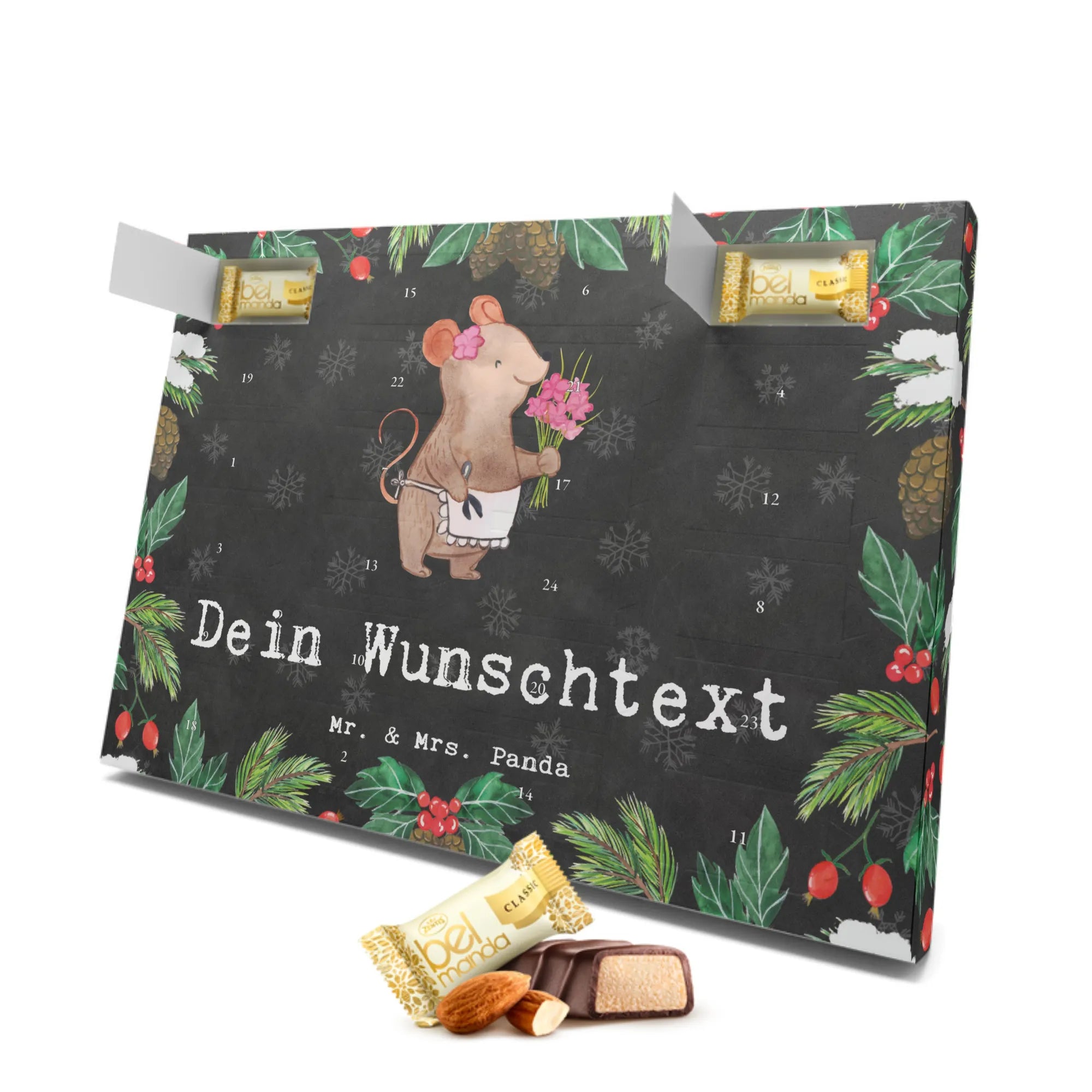 Gefüllt mit 24 köstlichen, einzeln verpackten Edelmarzipan Pralinés, bietet dieser Kalender täglich eine süße Überraschung in der Vorweihnachtszeit. Die niedliche Maus, die stolz ihre Blumen präsentiert, ist ein liebevolles Motiv, das jedem ein Lächeln ins Gesicht zaubert.