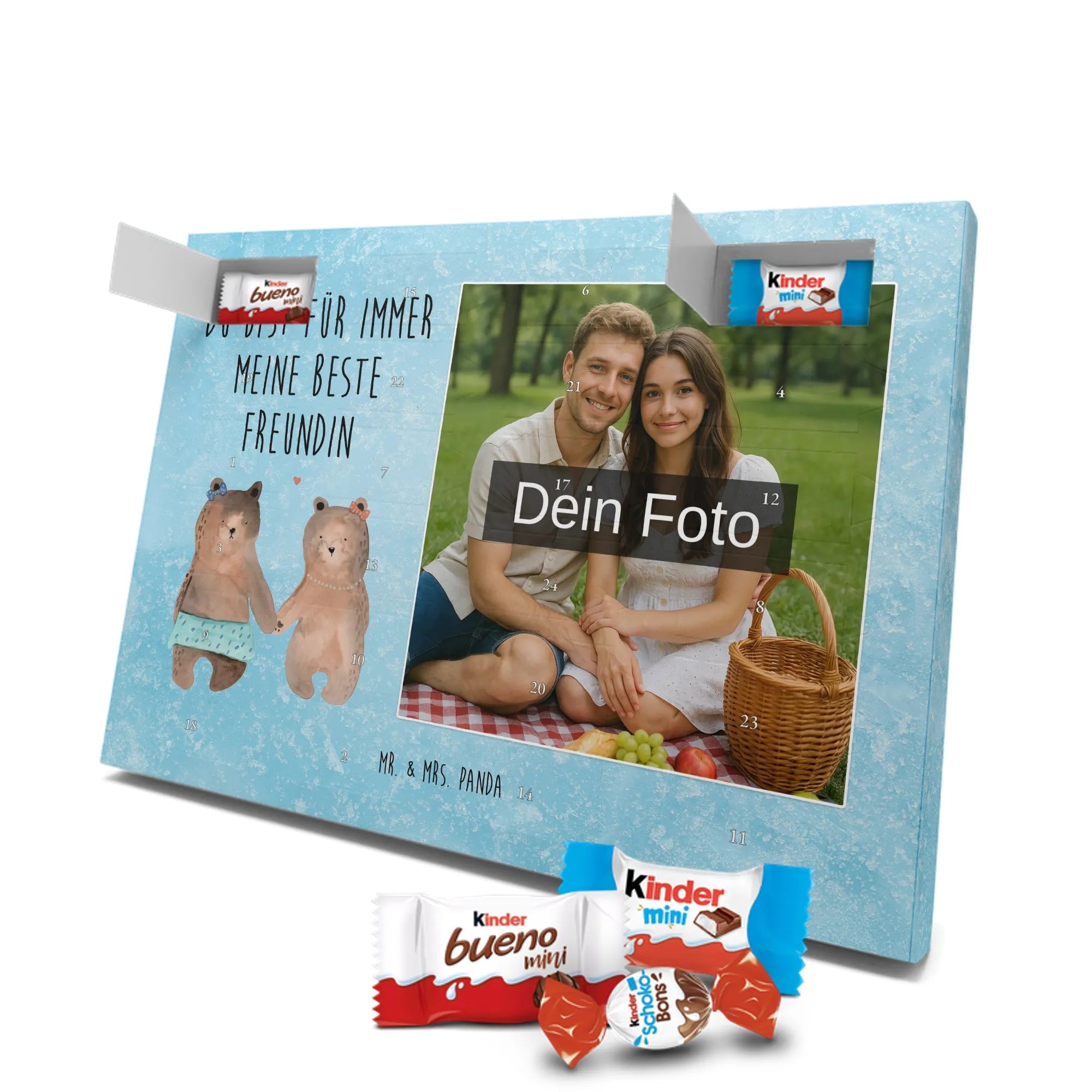 🐼 Personalisierter Schoko-Foto-Adventskalender mit deinem Bild, Mr. & Mrs. Panda Motiven und gefüllt mit kinder® Schokolade.