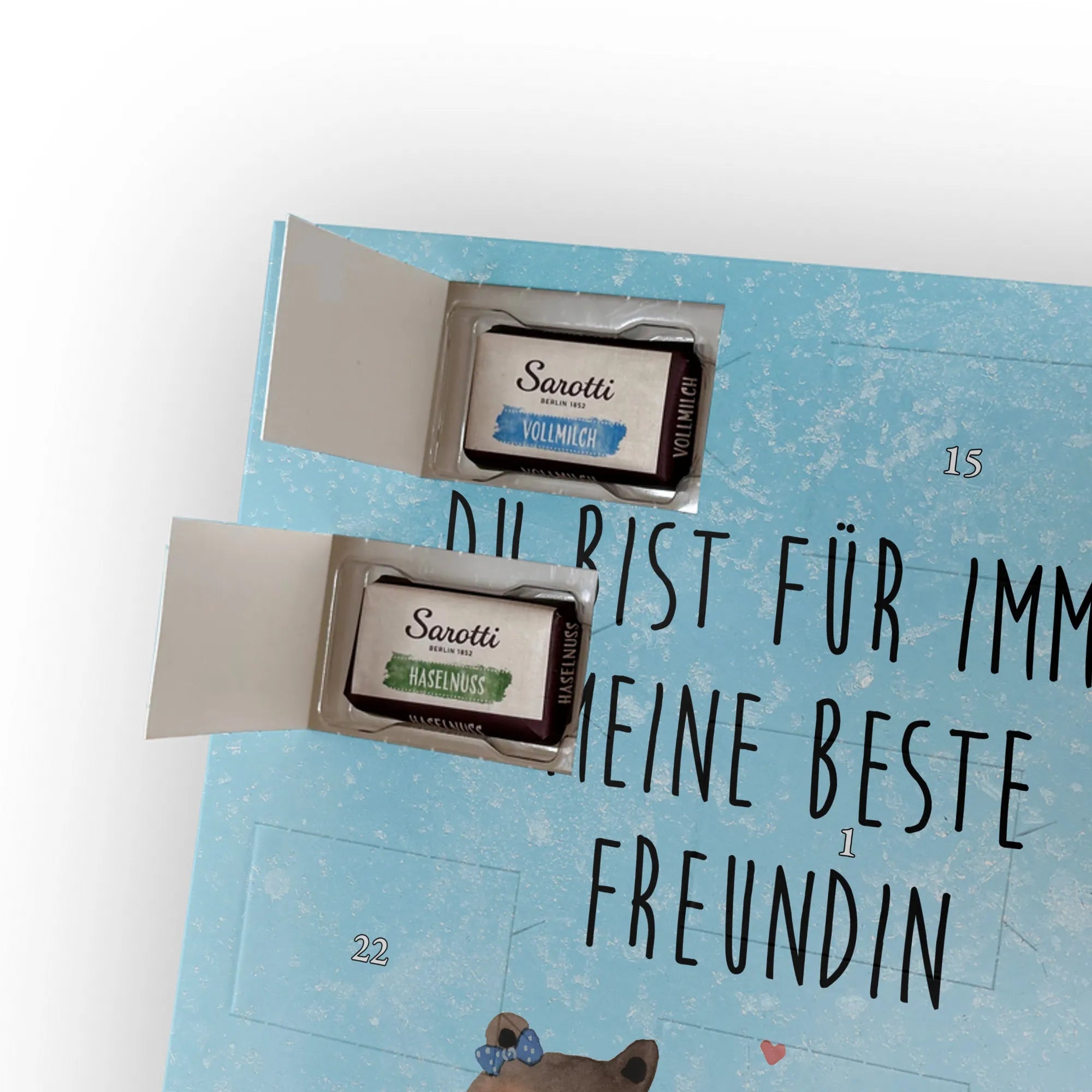 Personalisierter Schoko-Adventskalender mit Foto – das kleine Weihnachtswunder von Mr. & Mrs. Panda! Verschenke jeden Tag Vorfreude: Der Kalender ist liebevoll gestaltet mit unseren herzlichen Illustrationen und Sprüchen, während dein Foto die persönliche Mitte bildet. Bitte lade ein hochauflösendes Foto hoch und prüfe den Bildausschnitt, damit nichts Wichtiges verloren geht. Nutze nur Bilder, für die du die Rechte hast. Die hochwertige, seidenmatte Veredelung und die bedruckten Seitenflächen garantieren ein edles Erscheinungsbild. Maße: 355 mm x 245 mm x 11 mm; lässt sich sowohl aufhängen als auch aufstellen. Achtung: Fotos werden nicht nachbearbeitet oder zugeschnitten; personalisierte Artikel sind vom Rückgaberecht ausgeschlossen. Gefüllt mit 24 einzeln verpackten Schokoladentäfelchen aus den vier Geschmacksrichtungen Vollmilch, Nougat, Zartbitter und Haselnuss – von Sarotti® und Confiserie Heidel®. Insgesamt enthält der Kalender 107 g Markenschokolade. Ein persönliches Geschenk mit süßem Inhalt, ideal für Partner, Familie und Freunde, verpackt mit der typischen Mr. & Mrs. Panda Liebe zum Detail.