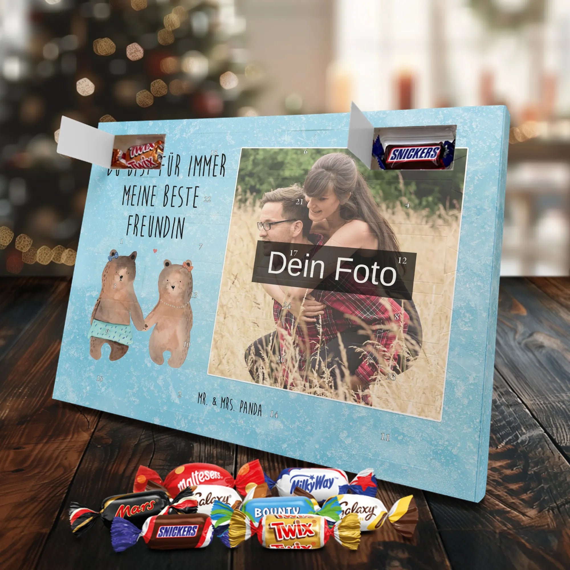 Liebevoller Foto Adventskalender personalisiert von Mr. & Mrs. Panda – der perfekte Begleiter durch die Adventszeit. Bedruckt mit unseren beliebten Motiven & Sprüchen, kannst du den Kalender mit einem persönlichen Foto versehen. Achte auf hohe Auflösung und einen passenden Bildausschnitt, damit das Motiv optimal zur Geltung kommt. Verwende nur Bilder, für die du die Rechte besitzt, um rechtliche Probleme zu vermeiden. Der Kalender bietet brillante Druckqualität, eine seidenmatte Oberflächenveredelung und bedruckte Seitenflächen. Maße: 233 mm x 178 mm x 24 mm. Besonderheit: Er lässt sich sowohl aufstellen als auch aufhängen. Bitte beachte: Die Fotos werden weder aufbereitet noch zugeschnitten, daher ist eine Rücknahme bei personalisierten Foto-Artikeln ausgeschlossen. Gefüllt mit MARKENNAMEN Schokolade und leckeren Schokoladenkugeln. Hinweis: Kann Spuren von Haselnüssen, Mandeln, Gluten und Soja enthalten. Kühl und trocken lagern. Schenke persönliche Vorfreude – jeden Tag ein kleines Highlight mit Schokolade und Erinnerungen.