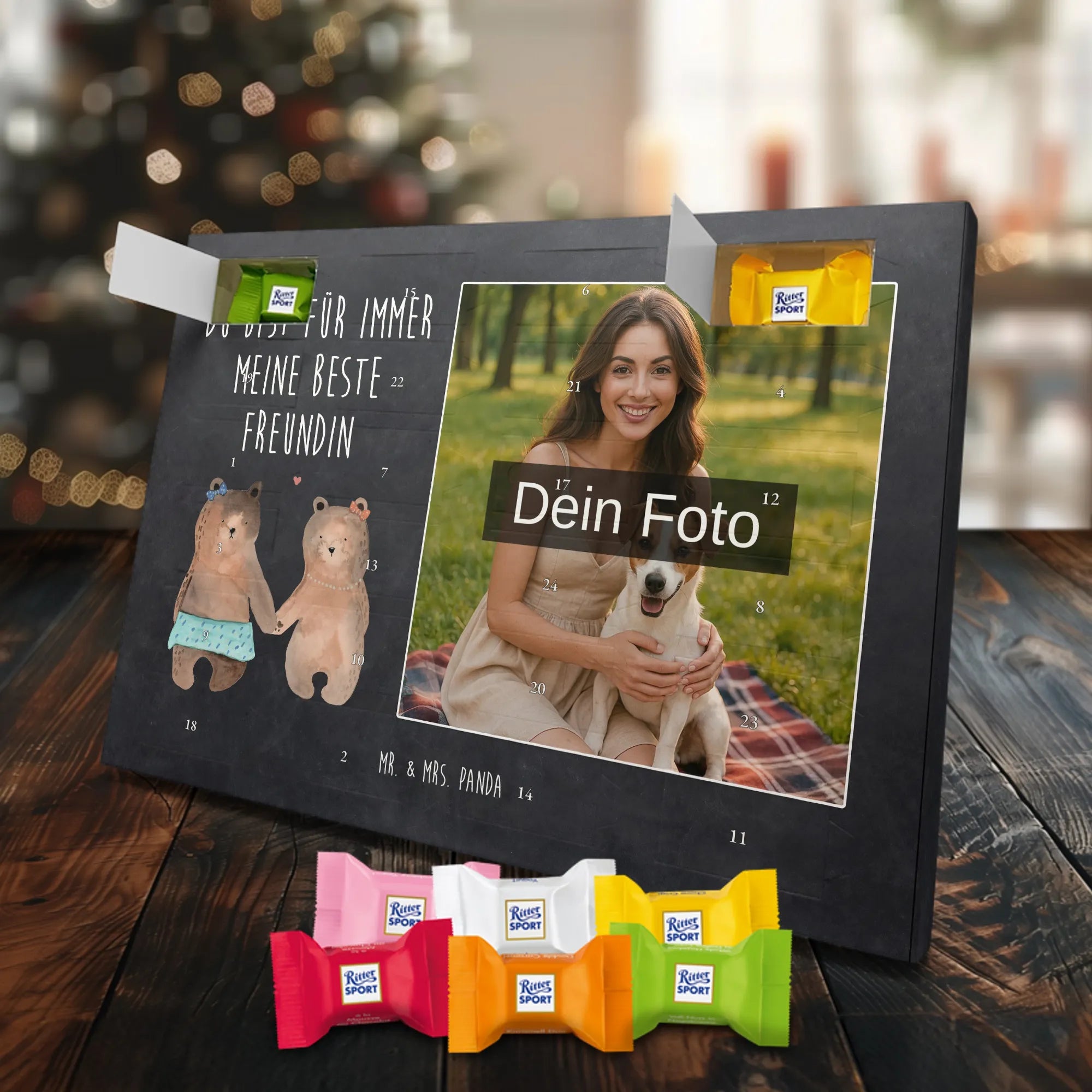 🐼 SCHOKO FOTO KALENDER: Hübscher, personalisierbarer Adventskalender mit bedruckten Seitenflächen und MARKENNAMEN Schokolade.