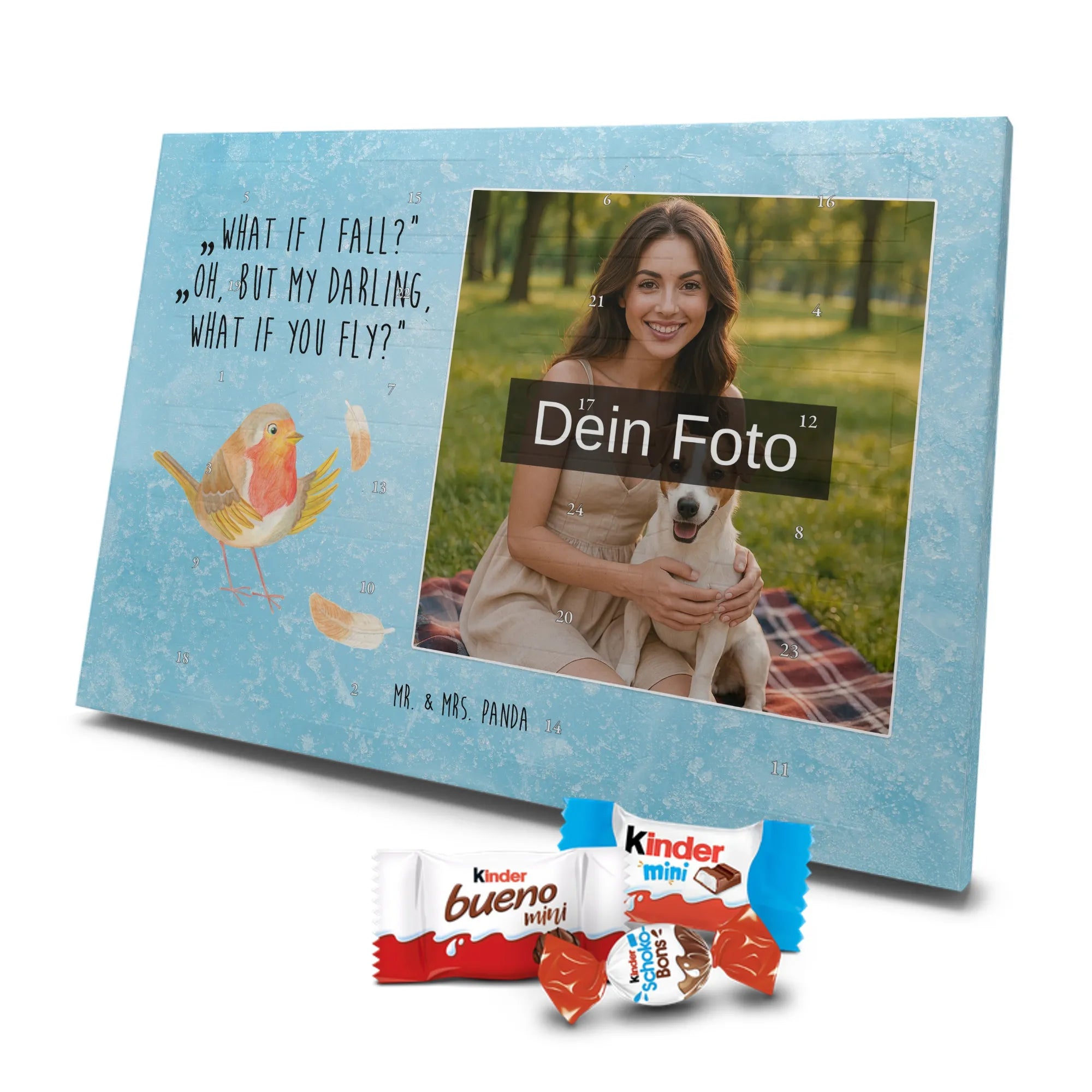 Personalisierter Schoko Foto Adventskalender von Mr. & Mrs. Panda – ein liebevoll gestaltetes Geschenk, das Vorfreude und Genuss vereint. In diesem personalisierten Schoko Foto Adventskalender kannst du dein Lieblingsfoto einsetzen und so jeden Tag im Dezember mit einem kleinen Lächeln öffnen. Der Kalender ist bedruckt mit unseren typischen Mr. & Mrs. Panda Motiven und süßen Sprüchen, die perfekt zu deinem Foto passen. Achte bitte bei der Bildauswahl auf hohe Auflösung, damit der Druck klar und brillant wird. Wähle einen passenden Bildausschnitt, damit keine wichtigen Details abgeschnitten werden. Lade nur Bilder hoch, bei denen du die Bildrechte besitzt oder die Zustimmung der abgebildeten Personen vorliegt. Die Fotos werden weder nachbearbeitet noch zugeschnitten; Rücknahme bei personalisierten Foto-Artikeln ist ausgeschlossen. Die Druckqualität ist brillant mit einer seidenmatten Oberflächenveredelung und bedruckten Seitenflächen für ein rundum schönes Erscheinungsbild. Maße: 355 mm x 245 mm x 11 mm. Praktisch: Du kannst den Adventskalender entweder aufstellen oder an die Wand hängen. Gefüllt ist der Kalender mit kinder® Schokolade – genauer: kinder® Schoko-Bons, kinder® Bueno mini und kinder® Schokolade mini. Bitte beachte: Um das beste Druckergebnis zu erzielen, lade ein hochwertiges Foto hoch und kontrolliere vor dem Bestellen den Bildausschnitt. Dieser Adventskalender ist das perfekte, persönliche Geschenk für Familie, Freunde oder für dich selbst – voller Liebe, süßer Überraschungen und dem unverwechselbaren Mr. & Mrs. Panda Charme.