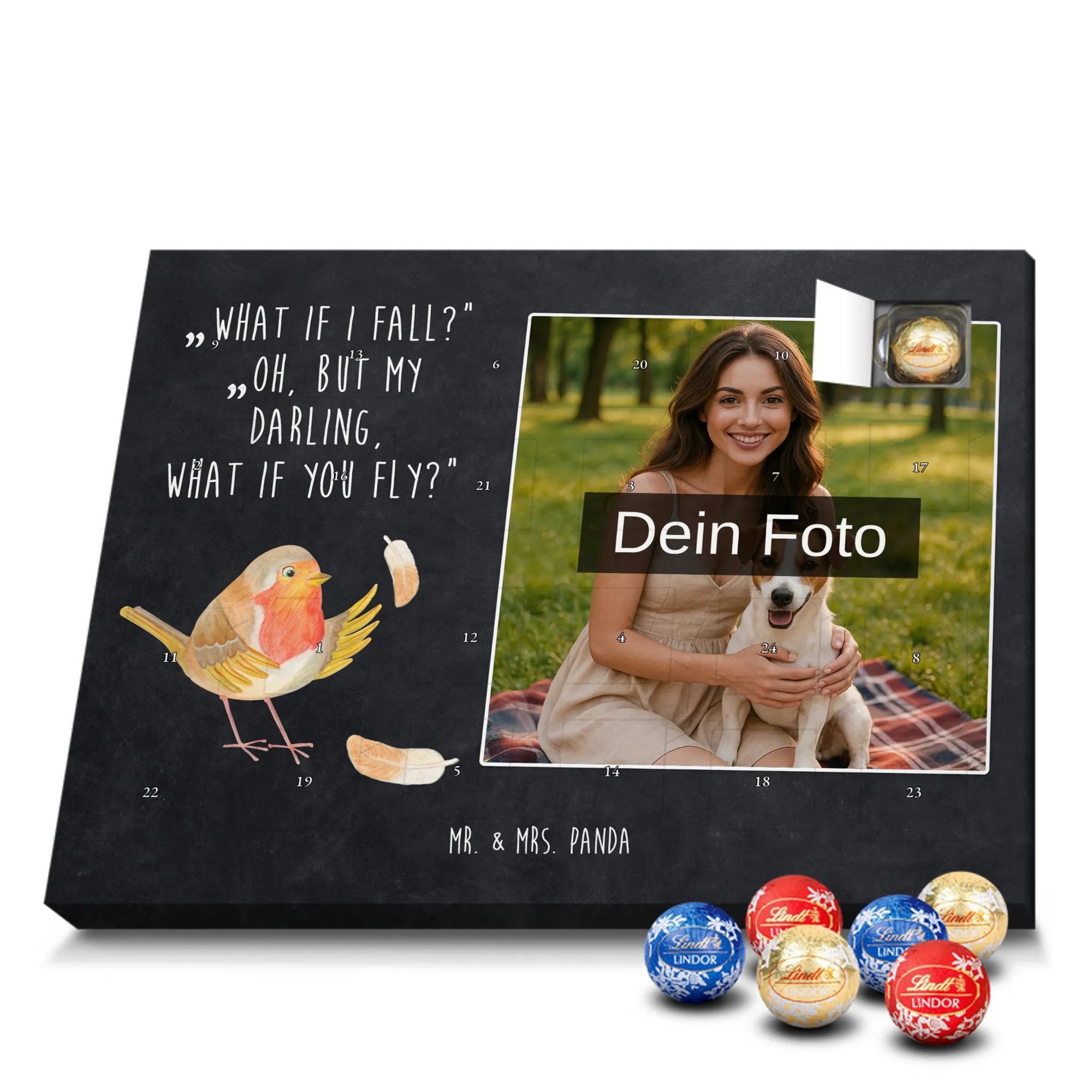 Unser bezaubernder Personalisierter Schokoladen Foto Adventskalender von Mr. & Mrs. Panda bringt persönliche Freude in die Vorweihnachtszeit. Du lädst ein Foto hoch, wir drucken es zusammen mit unseren liebevollen Illustrationen und Sprüchen – so entsteht ein ganz persönliches Geschenk. Achte auf hohe Bildqualität und darauf, dass der Bildausschnitt passt, denn wir nehmen keine Anpassungen am Foto vor. Die Verarbeitung ist hochwertig: seidenmatte Oberflächenveredelung, bedruckte Seitenflächen und eine stabile Konstruktion. Der Kalender kann sowohl aufgehängt als auch aufgestellt werden – flexibel und hübsch. Maße: 233 mm x 178 mm x 24 mm. Gefüllt mit Lindt Lindor Markenschokolade: 24 einzeln verpackte Markenschokoladen Kugeln, Sorten: Vollmilch, Feinherb und Weiße Schokolade. Zutatenhinweis: Zucker, pflanzliches Fett, Kakaobutter u.v.m.; kann Spuren von Haselnüssen und Mandeln enthalten. Wichtig: Lade nur Fotos hoch, für die du Nutzungsrechte hast; personalisierte Foto-Artikel sind vom Umtausch ausgeschlossen. Verschenke einen Advent mit Herz von Mr. & Mrs. Panda.