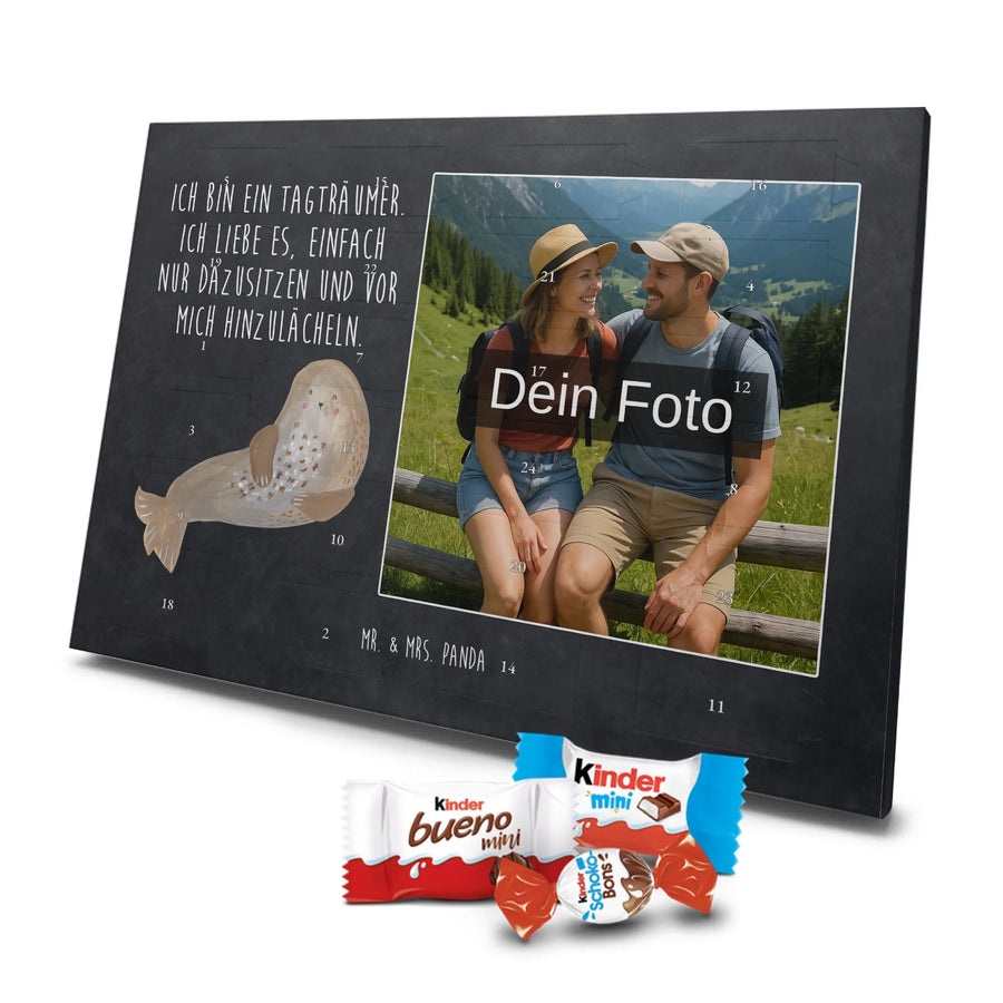 Schoko Foto Adventskalender personalisiert – ein zauberhaftes Produkt von Mr. & Mrs. Panda, das Erinnerungen und Süßigkeiten kombiniert. Gestalte die Vorderseite mit einem persönlichen Foto und überrasche deine Liebsten jeden Tag im Advent. Unsere Designs mit niedlichen Illustrationen und liebevollen Sprüchen runden das Foto perfekt ab. Bitte lade ein hochauflösendes Foto hoch und prüfe den Bildausschnitt, damit das Druckbild optimal wird. Verwende nur Bilder, für die du die Rechte besitzt oder die Freigabe der abgebildeten Personen vorliegt. Beachte: Wir schneiden oder bearbeiten die Fotos nicht; personalisierte Foto-Artikel sind von der Rückgabe ausgeschlossen. Der Kalender besticht durch brillante Druckqualität, seidenmatte Oberflächenveredelung und bedruckte Seitenflächen für ein hochwertiges Finish. Maße: 355 mm x 245 mm x 11 mm. Du kannst den Kalender aufstellen oder ihn an der Wand aufhängen. Gefüllt mit kinder® Schokolade – inklusive kinder® Schoko-Bons, kinder® Bueno mini und kinder® Schokolade mini. Ein warmherziges, persönliches Geschenk mit dem typischen Mr. & Mrs. Panda Flair, das Vorfreude und Geschmack vereint.